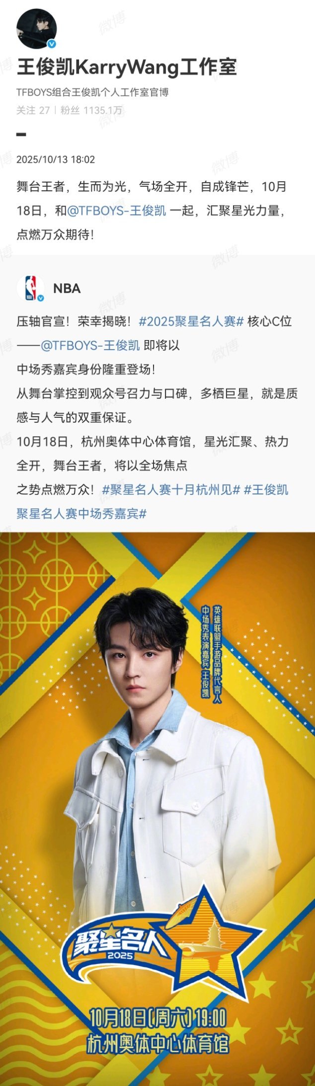 NBA压轴官宣,王俊凯将以中场秀嘉宾身份参加!