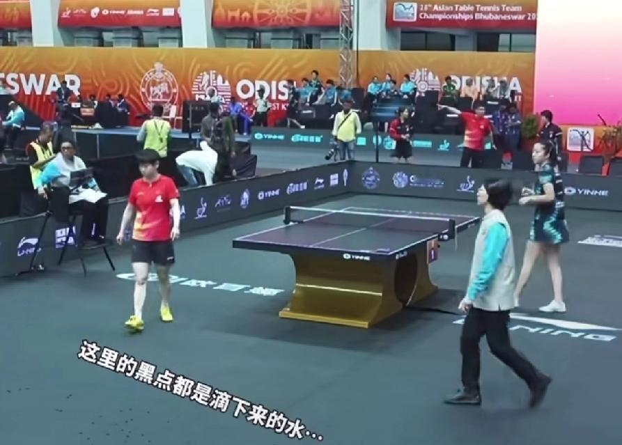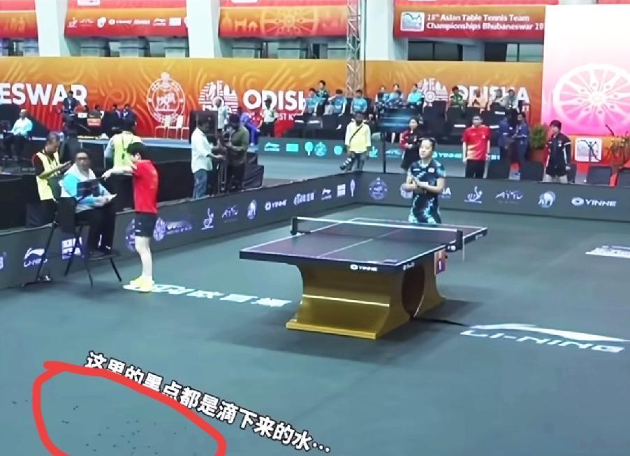 亚锦赛这“草台班子”, 房顶漏雨, 莎莎直接找裁判“告状”。 亚锦赛半决赛, 国乒女团对战韩国女队, 第一盘莎莎对战申裕斌。 还没有开打, 莎莎就发现地面上的水滴。 于是她赶紧找裁判一边比划一边说。 这真是离谱到家了, 昨天比赛无人机满天飞, 今天又开始滴水。 这是莎莎发现了, 如果没发现来回跑动, 很容易滑倒。 真是无了个大语, 听到莎莎脆脆声声地说: “它这上边在滴水。” 真是把咱们莎莎干无语了, 这叫什么事, 真是一边打比赛, 还得一边注意有没有“天降祥瑞”。 还真是第一次见, 一边打比赛一边拖地的。 (图片源自于水印)