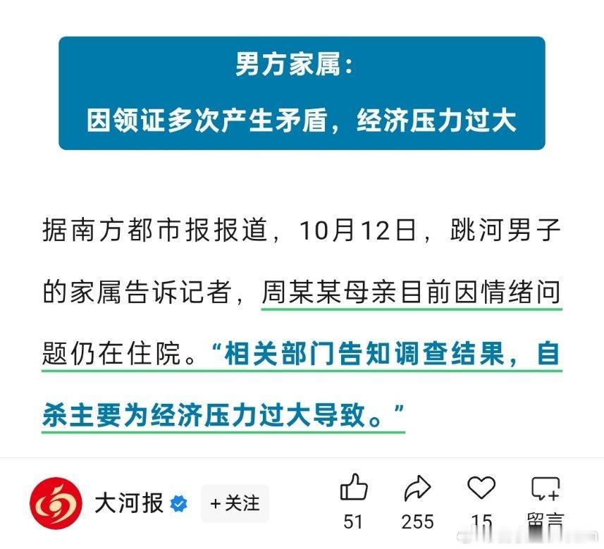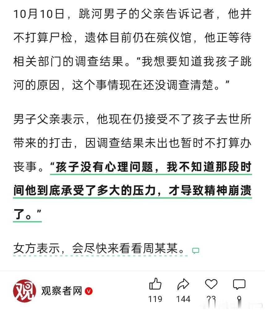 10月14日报道:周某某母亲目前因情绪问题仍在住院。“相关部门告知调查结果,自杀主要为经济压力过大导致。”