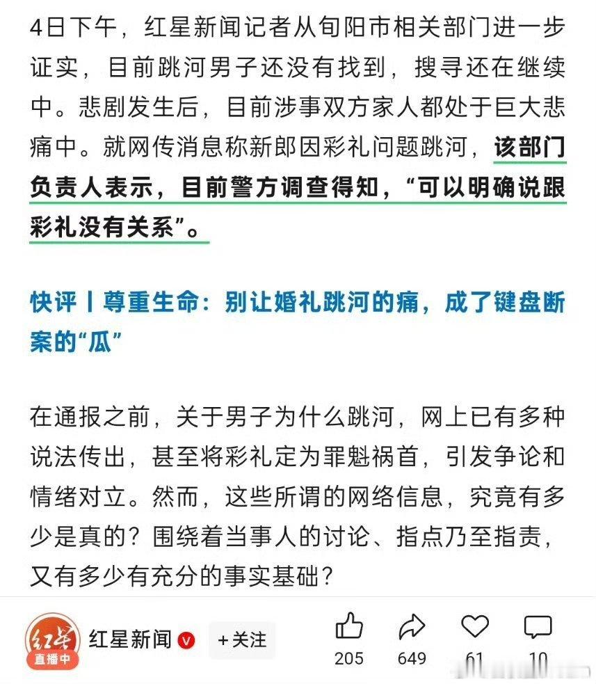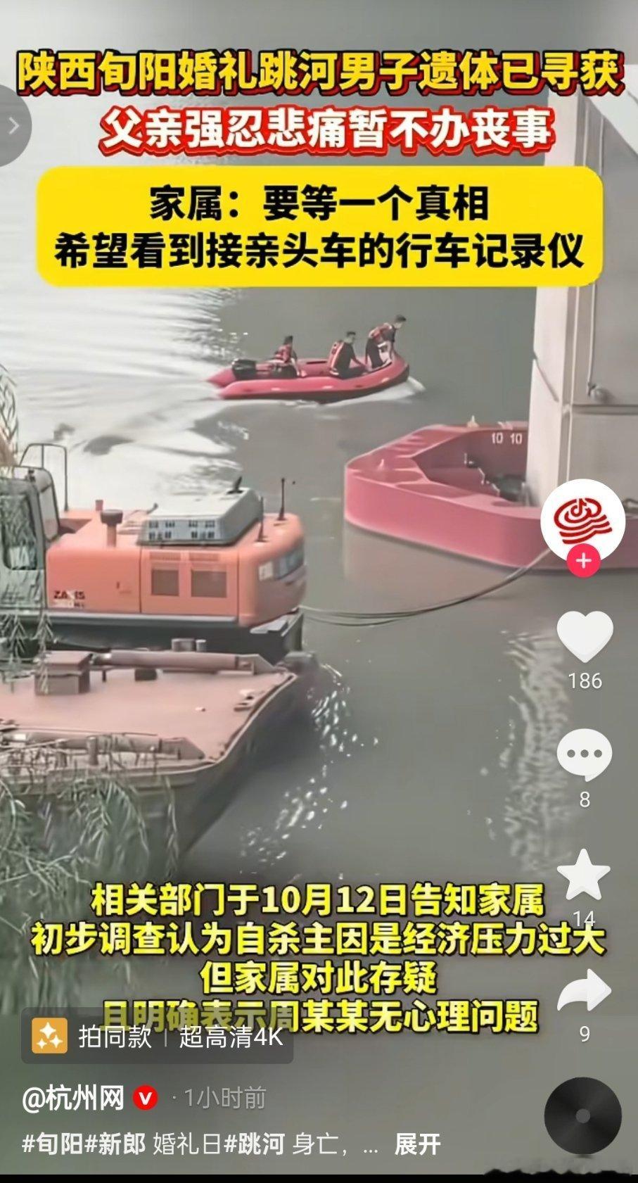 婚礼当天跳河男子最后一句话到底是怎么回事?我们都在等待一个事情的真相,是什么原因就公布。但无论结果是什么,死者为大,女方都应当要把所有婚恋费用全部归还给男方家属![摊手][摊手]