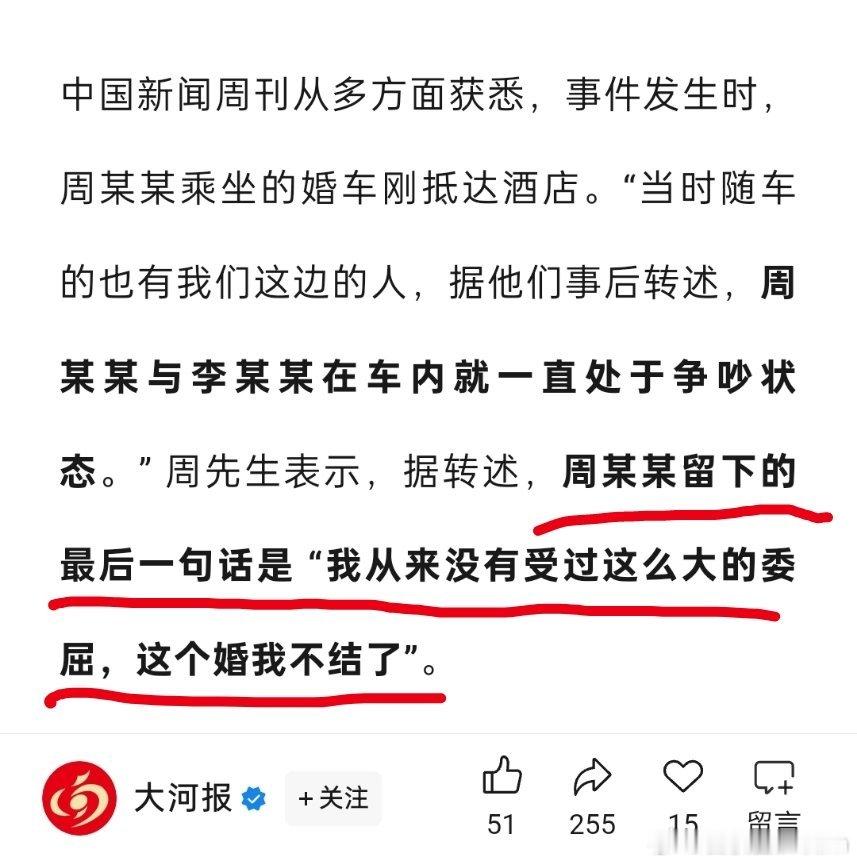 10月14日报道:周某某留下的最后一句话是 “我从来没有受过这么大的委屈,这个婚我不结了”。