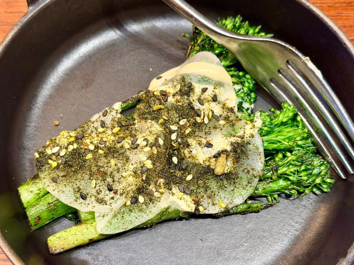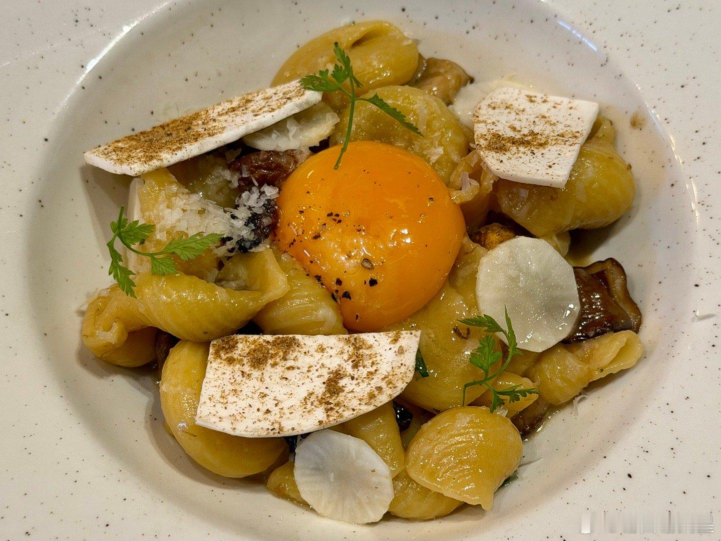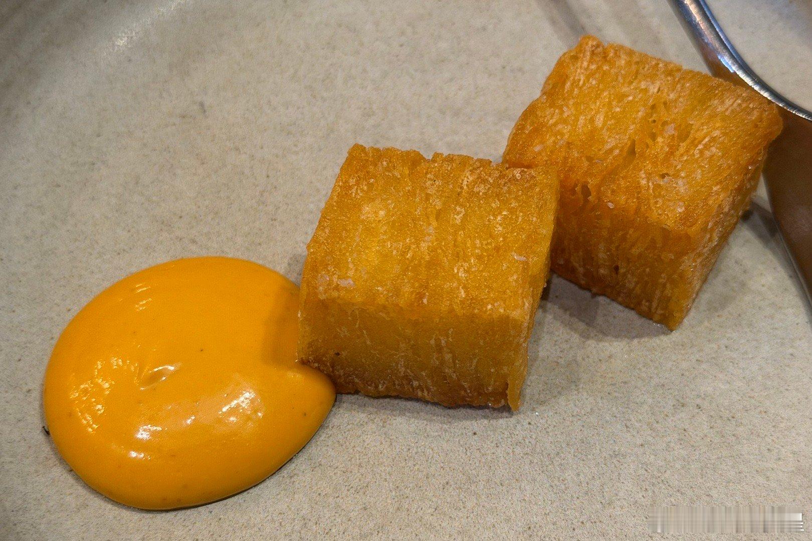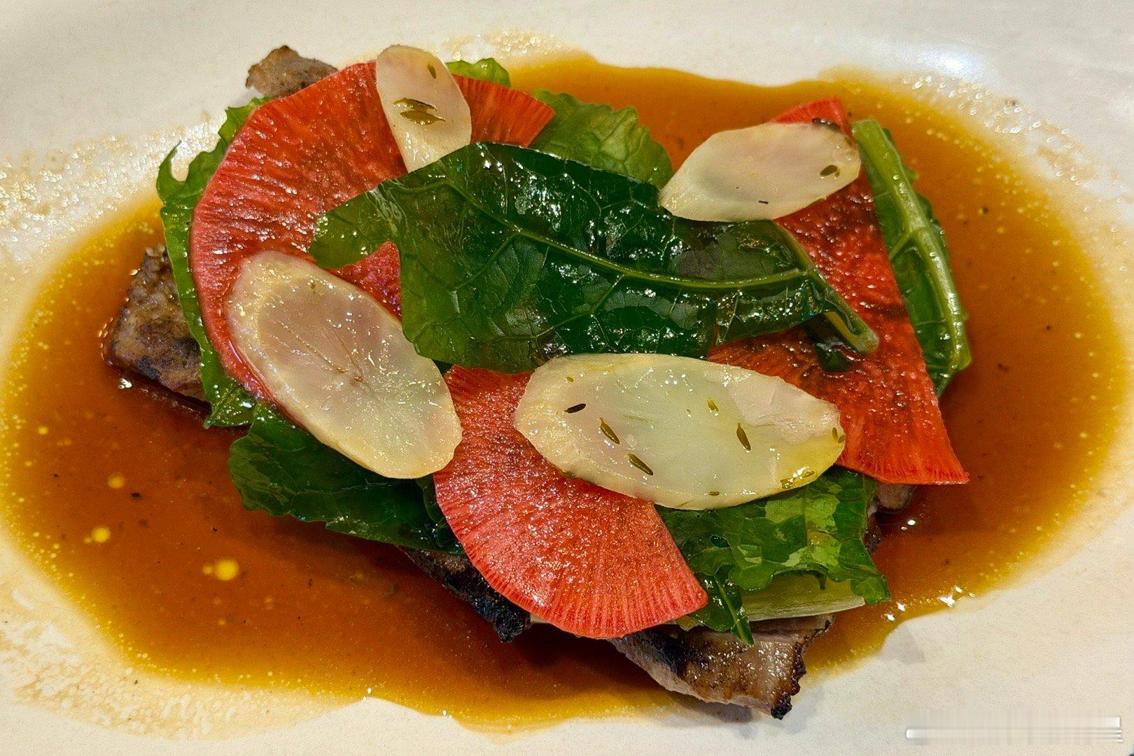 这家主打地中海风味,上来先给酸酵面包和黄油,第一个前点是蟹肉海藻挞,咸香偏咸。图1是第一道前菜,黄尾鱼、醋渍红肉萝卜配柠檬酱汁。淡酸的冷菜,鱼肉鲜口。图2是牛肝菌贝壳面、帕玛森干酪、菊芋与腌渍蛋黄。这道是主食,咸了。图3是嫩茎西兰花配味增,酸甜口的烤蔬菜。