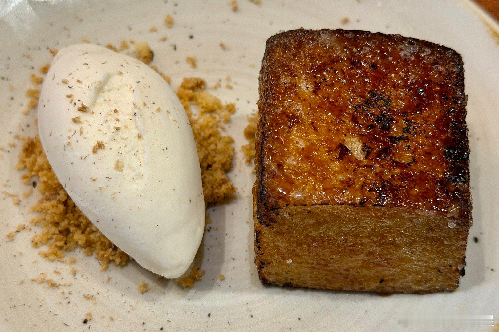 图4是炭烤多佛鲽鱼、彩虹甜菜、松露黄油与海甜菜,酸香的黄油酱配烤鱼,还可以。图6是伊比利亚猪肩肉、菊芋酒香炖菜与油菜苔。酸汁烤猪,猪肉烤的还不错。图7是阿格里亚土豆,皮烤的比较有硬度,蘸酱吃是咸口。图8是法式吐司配零陵香豆冰淇淋,脆皮吐司烤得很好,里面十分软糯。