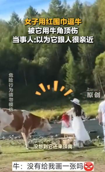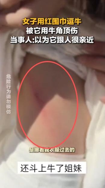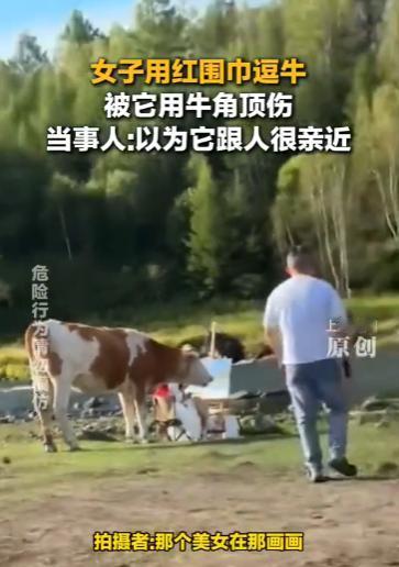 “这下后悔了吧!”10月11日,内蒙古,一女子写生时被牛打扰,她扯下脖子上的红围巾逗牛玩,谁知温顺的牛看到红围巾直接一头撞了过去,女子的腰被顶伤,网友:还逗牛,没看过斗牛吗? 看过斗牛比赛的人都知道,斗牛士拿着红布不断抖动,吸引牛撞过来,其实牛是色盲,红色并不会让牛激动,抖动的红色才是让牛撞过来的关键。 一名女子来到草原写生,正在专心画画时,一头牛突然从女子背后碰了她一下,女子被吓了一跳,转头看见温顺的牛后,她以为这头牛跟人很亲近,立马来了兴趣,想逗逗它。 女子顺手解下了自己脖子上的红围巾,放在牛的眼前,见牛没有反应,女子开始抖动手里的红围巾,吸引牛的注意力。 谁知,红围巾一抖动起来,牛的情绪立马开始激动,还没等女子反应过来,它直接朝着女子一头顶了过去,坚硬的牛角擦着女子的衣服,划伤了她的腰部。 这下可把女子吓得不轻,划伤的位置留下了一个长长的红印子,有的地方还破了皮,看起来十分骇人。 不少网友觉得女子胆子太大了,竟然敢模仿斗牛士,这下自作自受腰被牛给撞伤了,女子也很后悔自己的行为,估计以后再也不敢拿红布逗牛了! 信息来源:《女生写生时逗牛被顶飞腰部受伤》大象新闻