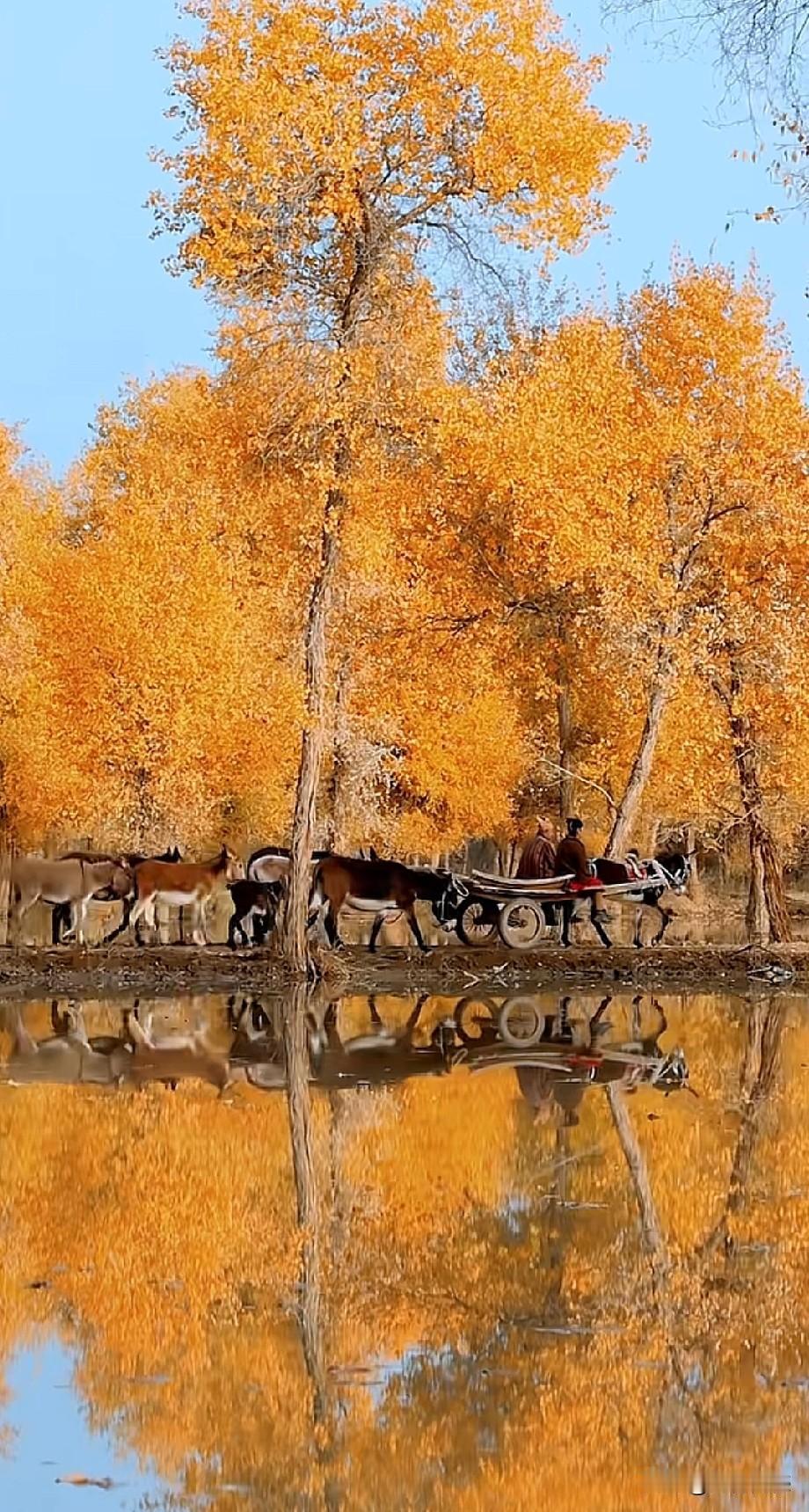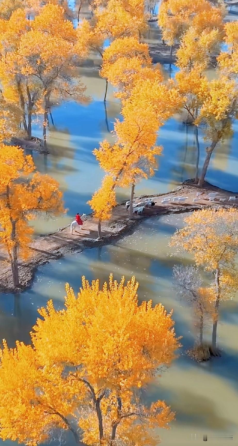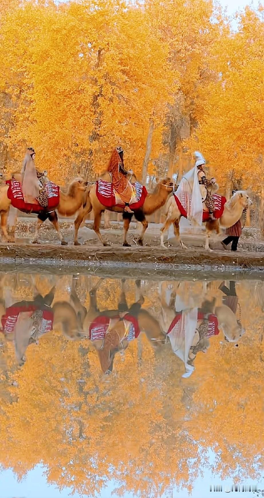 这里的树叶金黄金黄的,虽然色彩比较单一,但是却有一种独特的、不同寻常的美,这与那些五彩斑斓的树叶是不一样的,这种单一颜色的树叶,显得特别的高贵,特别的清新,特别的热情,大美新疆的美,太苍茫了,太辽阔了,有生之年,一定要到新疆去看一看,如此美景要是不看的话,真是白来世上走一回了!