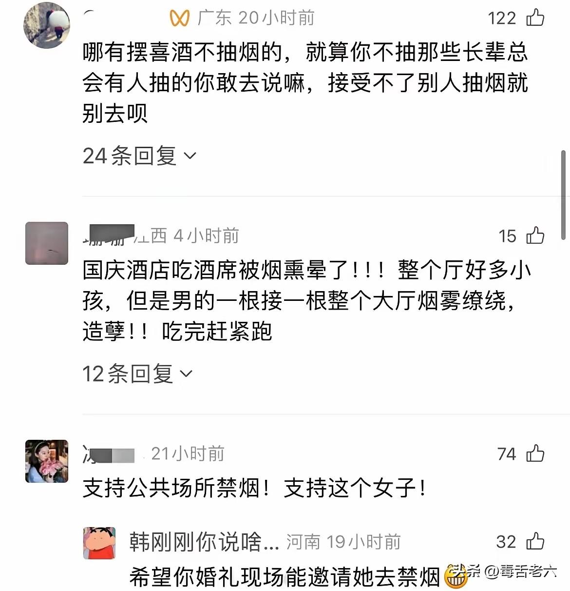 云南,一女子去参加婚宴,发现有宾客吸烟,于是上前阻止,然而女子行为引起网友不满,网友:“你去吃席的,你有什么权利要求别人的婚宴禁止吸烟!”本想着凭自己一己之力让整个宴会厅没人敢抽烟了,自己的办了一件好事。然而有网友不愿意了,声称:“哪有摆喜酒不抽烟的,没人敢抽烟,是没人和你计较,这种大喜的场合,吸烟的人是给新郎新娘面子而已!” 这事小得像婚宴上的一碟花生米,却嚼出了公共意识的咸淡——女子劝的不是烟,是身边人别被二手烟呛着,是婚礼别裹着“热闹”的壳子伤了人。 可网友的反对里藏着另一种逻辑:婚宴就该“随大流”,吸烟是“给人面子”,连健康都能让位于“习俗”。 哪有什么“该有的吸烟场合”?老一辈觉得婚宴要递烟才热乎,可现在的孩子会躲着烟味哭,老人会咳得直拍胸脯,这些真实的难受,咋就比“面子”不重要? 女子劝阻不是“越界”,是替那些没法开口的人发声——我也是来吃喜酒的,我也想呼吸点干净的空气。 说她“没权利”的人,其实是把“大家都这么做”当成了“没错”的挡箭牌。婚宴是喜事,可喜事不该成为不文明的借口。真要讲面子,新人更想在没烟味、大家都舒服的场合收祝福,不是吗? 她没错,错的是把“惯着坏习惯”当成“懂人情”的世故。婚礼要暖,得暖在对彼此的在意,不是暖在一屋子呛人的烟里。 各位读者你们怎么看?欢迎在评论区讨论。