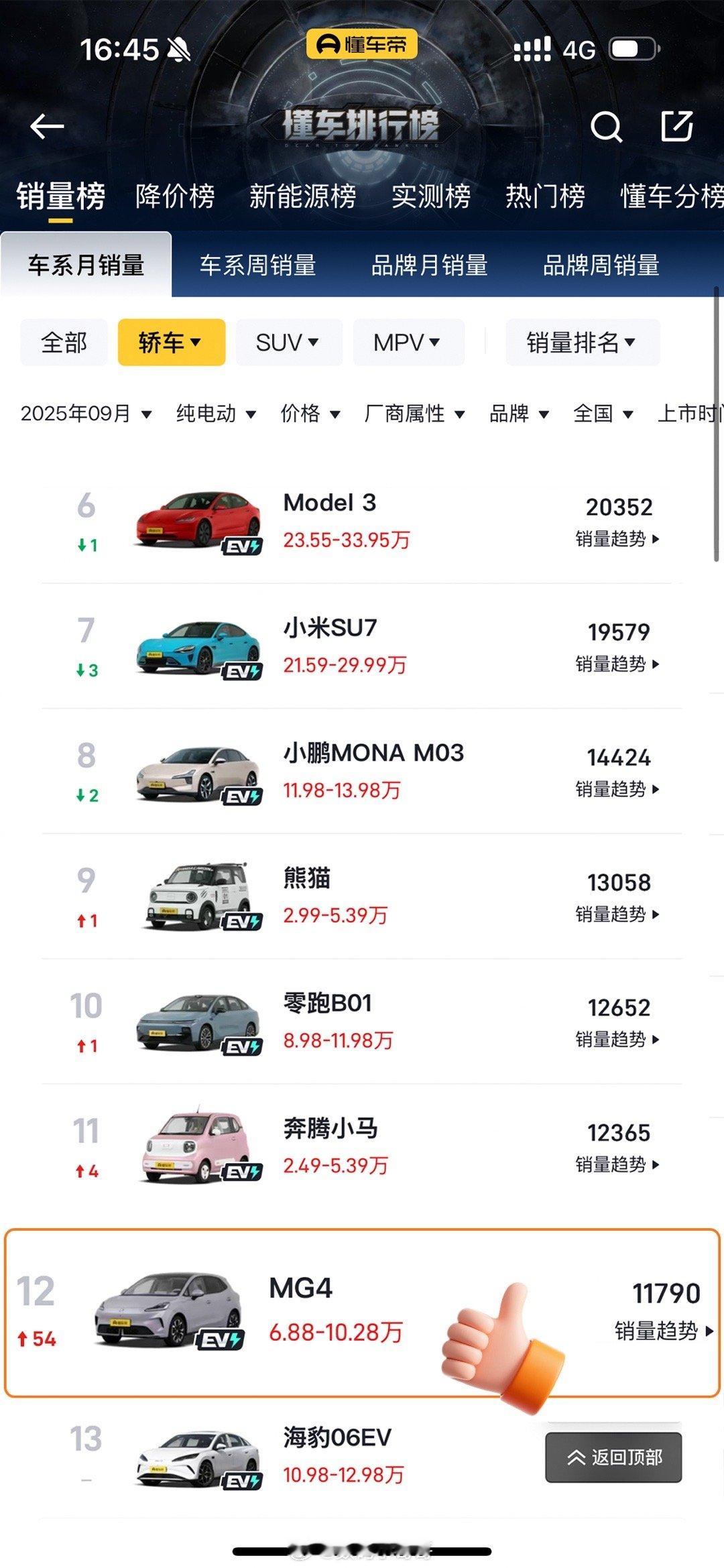 MG4的销量真猛,上市首月就卖了11790辆,纯电轿车销量TOP12!智驾数码团