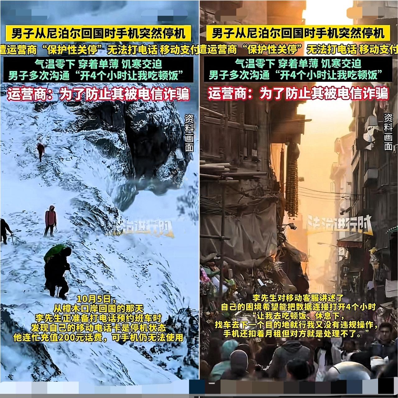 西藏,一38岁男子从尼泊尔回国,在樟木口岸时,他手机被停机,他以为欠费了,就充了200元话费,还是没开机,他联系移动客服,客服却说:为了防止你被诈骗,移动对你手机号“保护性关停”,想要开机必须去移动厅办理。可他去营业厅,营业厅又说异地不能办理,只能回新疆办。 这位李先生在新疆工作,此前和朋友去尼泊尔徒步。回国前他遭泥石流困在大巴上35小时,又徒步3小时才到口岸,又累又饿时手机突然停机,这让他慌了神——现在干啥都离不了手机。 当时他身处海拔4000多米、零下气温还停电的聂拉木县,没现金、没手机支付,吃住行都成问题,简直是绝境。他立刻联系移动客服,对方给出三种开机方式:去就近营业厅、返回新疆或网上验证。但当时天黑缺光,网上验证拍不清;营业厅也早因停电关门。他恳请客服开4小时网应急,却被以“没权限”拒绝。 没办法,他只能找警察帮忙,直到晚上10点才住上酒店。第二天,他取消珠峰徒步计划,专程赶去日喀则营业厅,却被告知新疆的卡处理不了,要么去拉萨,要么回新疆。 他又折腾着往拉萨赶,半路接到移动电话说不用去了,48小时内给答复。可等了一周,别说开机,连电话都没收到,无奈之下只能办张电信卡应急。 更让他生气的是,有次客服同意开网,结果只用5分钟就断了。后来他再问,客服又改口称人身安全受威胁时有权限临时开机——可当时他都快冻僵了,怎么就没人管?现在他就想要回200话费、报个路费,再问清楚为啥关停,结果全石沉大海。。你觉得移动该为这事负责吗?异地办卡难题又该如何解决?
