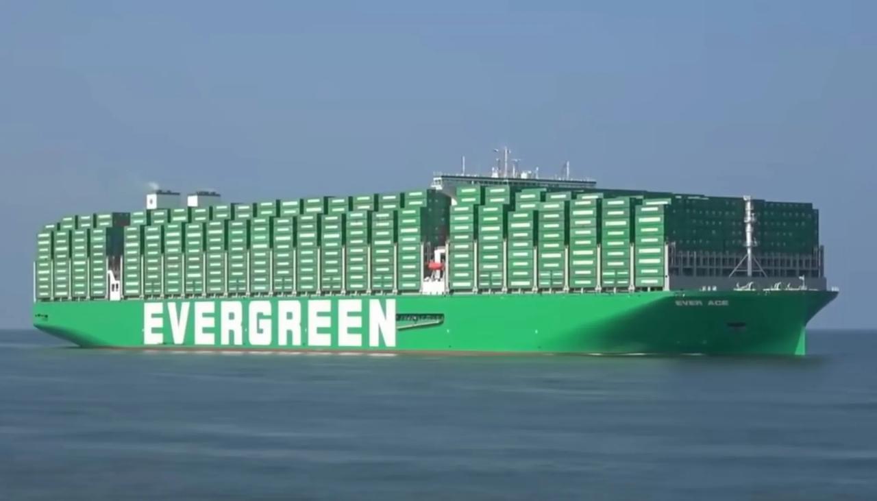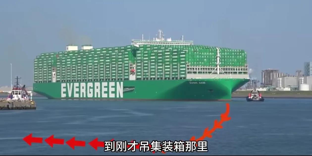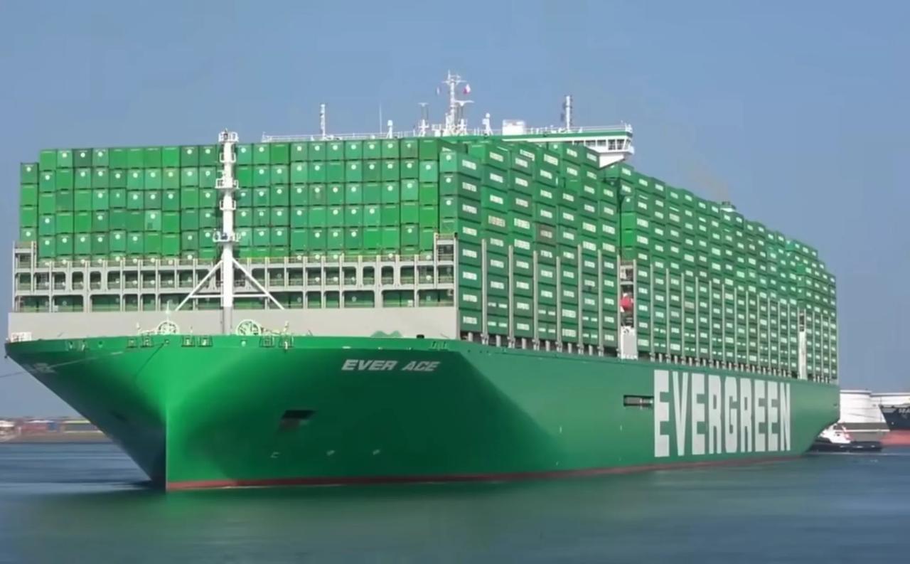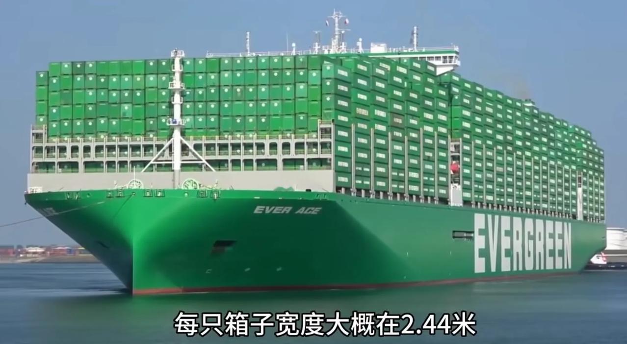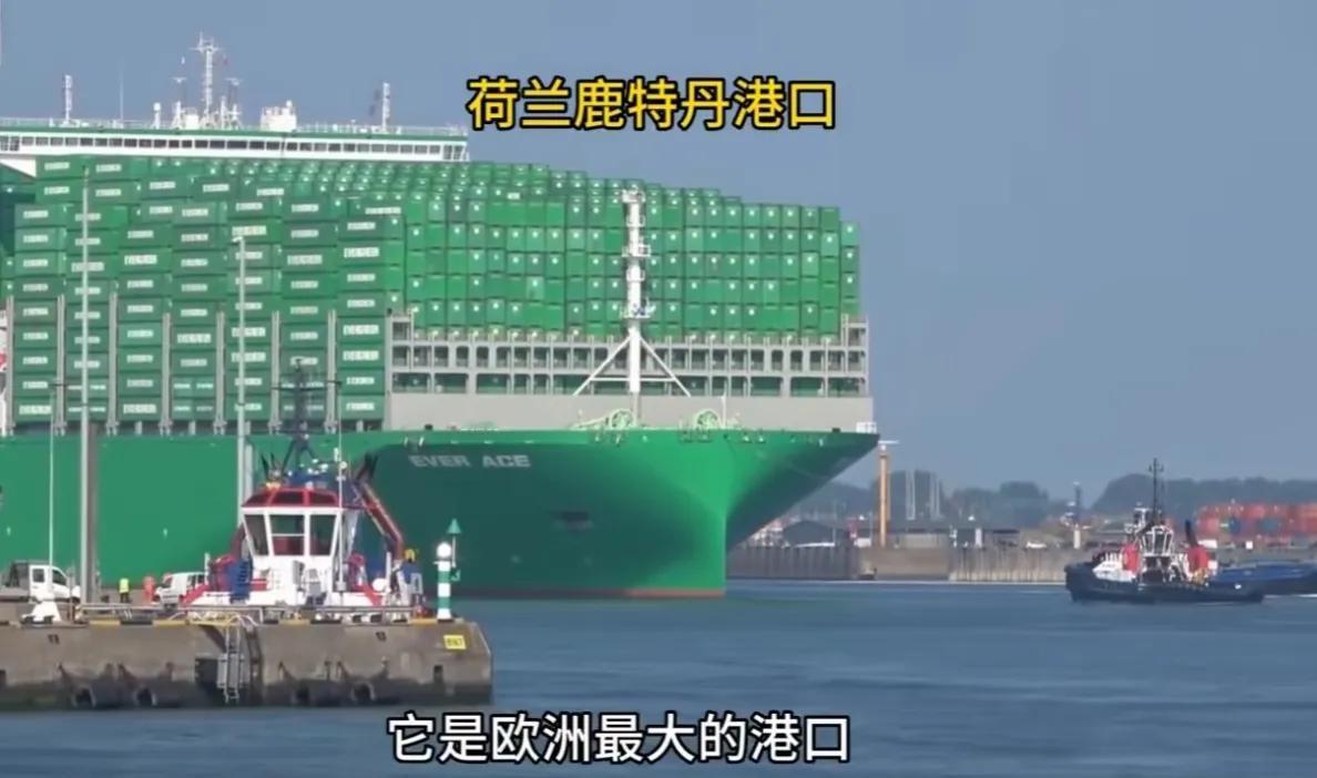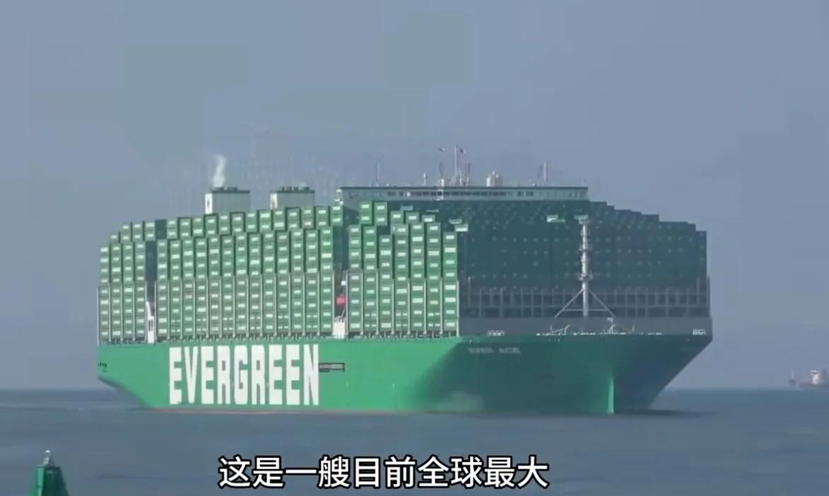 全球最大货轮停靠港口场景 EVER ACE“长范号”,来自中国宝岛台湾长荣海运,长度达到400米,宽度达到62米,甲板总面积接近四个足球场加起来那么大,高度也达到30米。