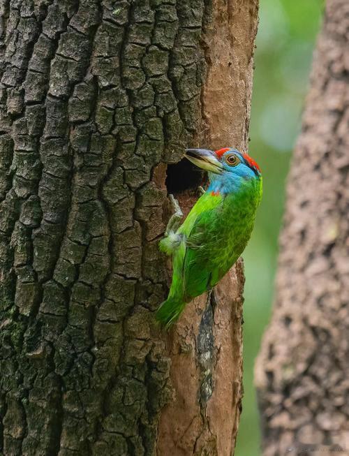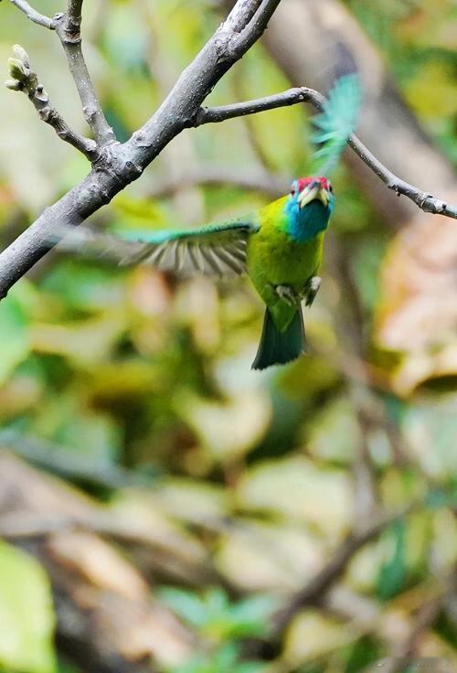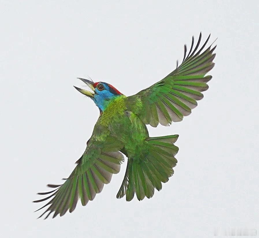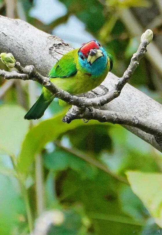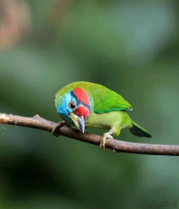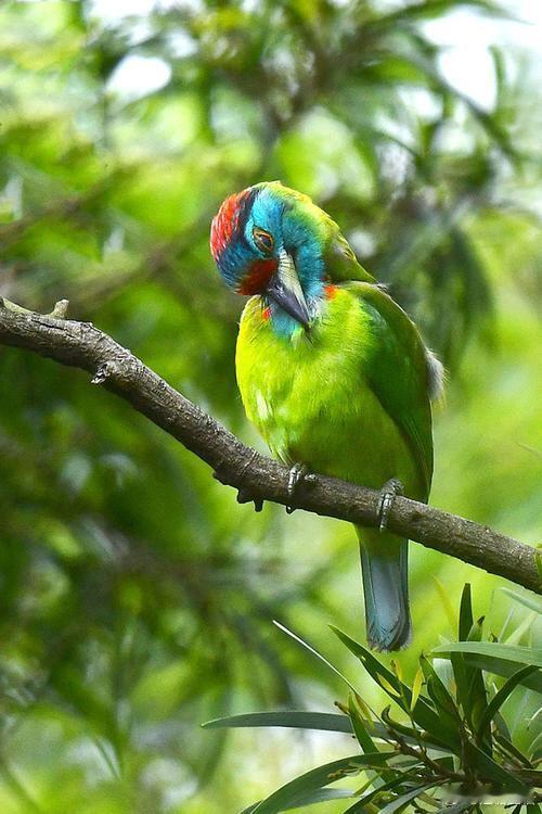 - 羽毛:头部呈红蓝相间的艳丽色彩,喉部湛蓝,身体翠绿,色彩搭配极具观赏性