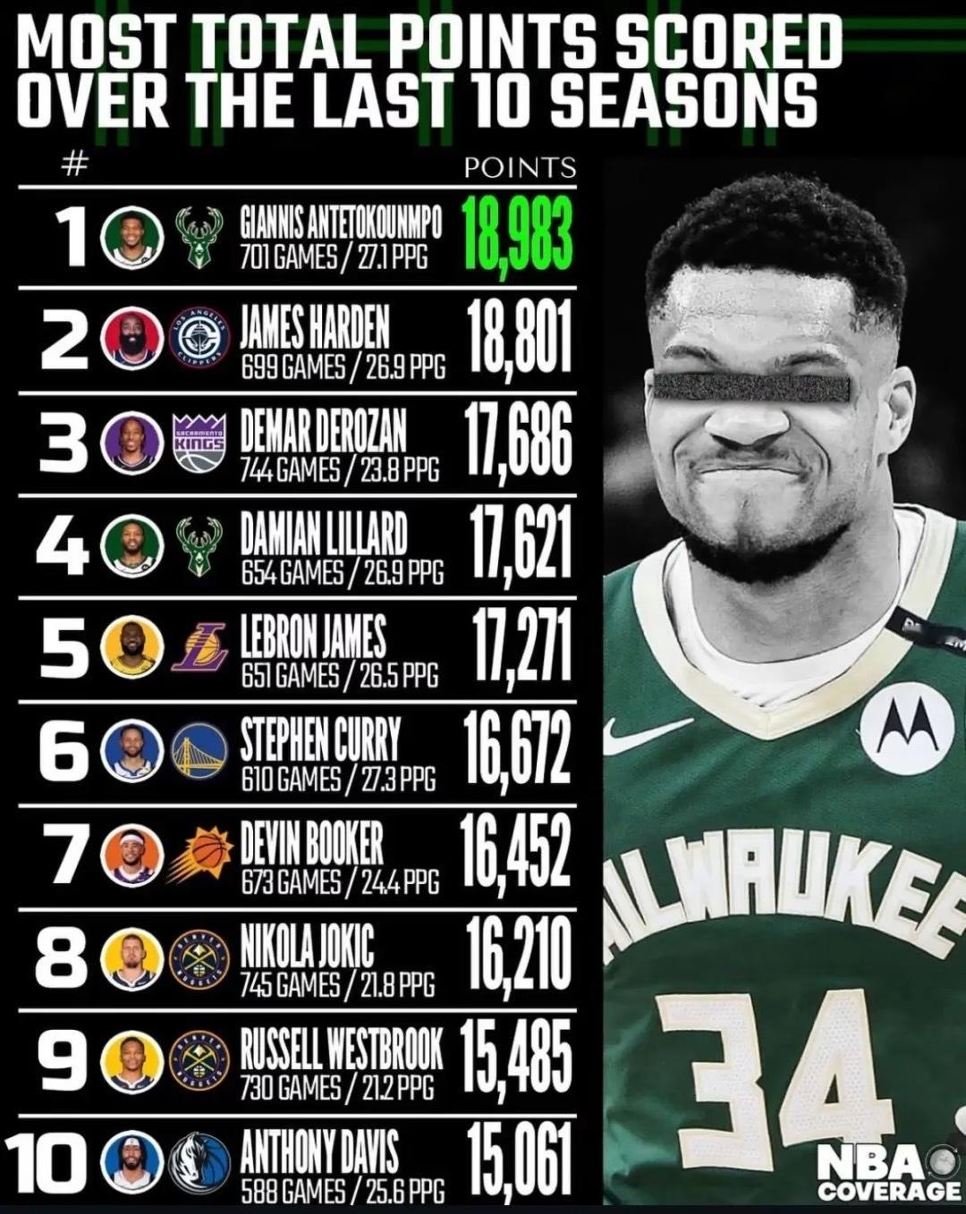 榜首的字母哥,其实受限于主教练的用人,他的场均出场时间不到34分钟,这10年是他的鼎盛时期,打个38分钟没啥问题,得分平20000也不会太难,但布登霍尔泽当年按点换人的策略,这某种程度上限制了字母哥的得分。
