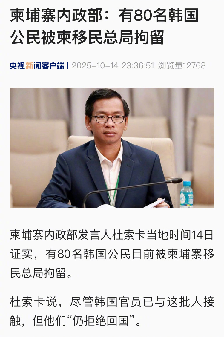 【柬埔寨内政部:有80名韩国公民被柬移民总局拘留】#约80名韩国人下落不明#柬埔寨内政部发言人杜索卡当地时间14日证实,有80名韩国公民目前被柬埔寨移民总局拘留。