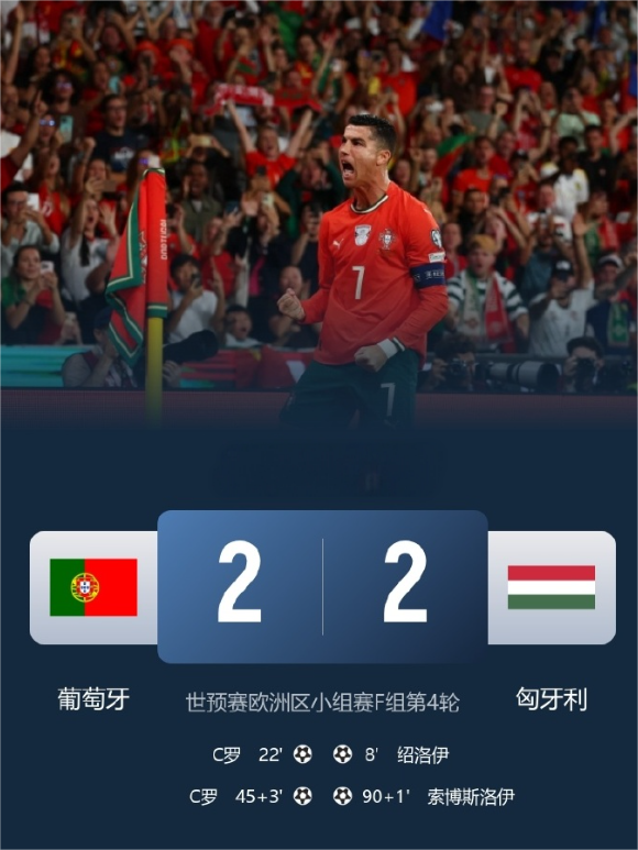 世欧预:葡萄牙2-2遭匈牙利绝平,C罗双响&个人41球独占世预赛射手王,葡萄牙连胜遭终结无缘提前晋级世界杯