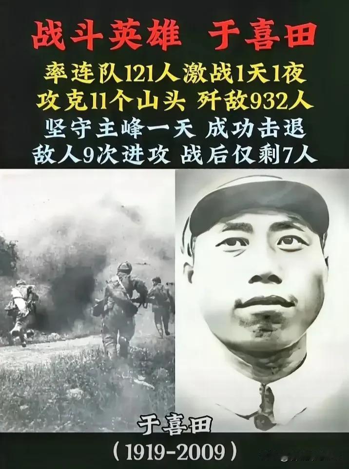 朝鲜战争中,因情报有误,志愿军一个连被敌军一个营团团包围,危机时刻,连长于喜田不仅没有带领全连战士突围,反而带领战士们,攻占了敌军11个主阵地,最终成功将敌军击退,还缴获大批武器弹药,创下了以少胜多的经典战例。 那会儿于喜田刚满26岁,山东莱西人,打小跟着爹娘种庄稼,1947年家乡解放时参了军,从解放战争的孟良崮战役打到淮海战役,手里的步枪换过三把,胸口还留着国民党军子弹擦过的伤疤。 到了朝鲜战场,他已经是志愿军第27军79师235团3连的连长,全连战士都信他——不是因为他官大,是因为每次打仗他都冲在最前面,从不把战士往火坑里推。 这场仗发生在1951年夏季防御战期间,3连原本接到的命令是拔除前沿的“107高地”据点,情报说那地方只有美军一个排驻守,负责警戒。 于喜田带着全连120多个战士,趁着凌晨的雾气往高地摸,快到山脚时,突然听见头顶传来“突突突”的重机枪声,子弹像雨点似的打在身边的石头上,溅起的碎石子砸得人生疼。 他赶紧喊“卧倒”,趴在土坡后抬头一看,才发现不对劲——高地上不光有重机枪,还有坦克的炮管从工事里伸出来,远处还能看见迫击炮阵地的炮口闪光,哪是什么排,分明是美军第25师的一个加强营,足足有400多人,还配了6辆坦克和8门迫击炮。 3连瞬间被夹在了山沟里,前面是敌军的火力网,后面的退路也被两辆坦克堵死了。 副连长爬过来,声音压得很低:“连长,撤吧!往主力方向突围,再耗下去全连都得交代在这!”周围的战士也都看着于喜田,眼神里有慌,但更多是等着他拿主意。 于喜田没急着应,从怀里掏出地图,借着晨光看了两分钟,又抬头观察了会儿敌军阵地,突然说:“不能撤!现在撤就是钻人枪口,敌军早把山口封死了,咱们一露头就得成活靶子。” 他指着高地上错落分布的11个小山头:“看见没?那是他们的主阵地,每个阵地也就一个班到一个排,靠无线电连在一块儿。咱们要是能逐个敲掉这些阵地,他们没了指挥,包围自然就破了。” 这话一出,战士们愣了——就120来人,要打400多敌军的11个阵地?于喜田看出大家的顾虑,拍了拍身边战士的肩膀:“咱们是志愿军,不是软骨头!他们人多,但阵地散;咱们人少,可心齐。只要敢打,就有活路!” 说完他把全连分成三个战斗小组,自己带一组攻最靠前的1号阵地,副连长带一组打侧翼的3号、4号阵地,指导员带剩下的人负责掩护和运送弹药。 1号阵地的美军躲在钢筋混凝土工事里,重机枪吐着火舌,于喜田让两个战士往工事口扔手榴弹,趁着烟雾,自己抱着炸药包就冲了上去。 炸药包炸响的瞬间,工事口塌了一半,他第一个跳进去,端着刺刀捅倒了正想开枪的美军士兵,战士们跟着冲进去,不到十分钟就拿下了1号阵地,还缴获了一挺M2重机枪。 打下1号阵地后,3连战士没歇气,接着攻2号阵地。 这处阵地有美军的迫击炮,炮弹不断落在周围,指导员喊着“注意隐蔽”,自己却被弹片划伤了胳膊,血顺着袖子往下流,他随便扯了块布条缠上,继续指挥战士们绕到迫击炮阵地后面。 两个年轻战士趁着敌军换炮弹的间隙,冲上去用刺刀解决了迫击炮手,正面的战士趁机冲锋,又拿下一个阵地。 从早上打到下午,太阳快落山时,3连已经攻占了8个阵地。战士们早就饿了,兜里的炒面早就吃完,水壶也空了,有的战士脚被石头磨破,有的胳膊中弹还在坚持。 于喜田的帽子被流弹打穿了个洞,头发都被火星燎了一撮,他没当回事,只是在打下第9个阵地时,看见一个刚满18岁的新兵牺牲在工事旁,手里还攥着没扔出去的手榴弹,他蹲下来,把新兵的眼睛轻轻合上,声音有点哑:“兄弟,咱们快赢了。” 最后攻第11号阵地——也就是敌军营部时,于喜田带着战士们从后山摸上去,听见帐篷里有人在喊,借着翻译的耳朵才知道,敌军营长正在跟后方打电话求援。他一挥手,战士们冲进去,没等敌军反应过来,就把营长和几个通讯兵堵在了帐篷里。 没了指挥,其他阵地上的美军开始乱了,有的往山下跑,有的举着枪投降,堵在退路的两辆坦克见势不妙,也轰隆隆地往后撤。 这场仗打下来,3连伤亡了12名战士,却攻占了11个敌军主阵地,击退了400多美军,还俘虏23人,缴获2门迫击炮、3挺重机枪、6支卡宾枪和1辆军用吉普车。 当团里的通讯员找到3连时,看见于喜田正带着战士们给牺牲的战友整理遗容,脸上全是土和血,只有眼睛亮得很。 后来,于喜田因为这场仗立了特等功,被授予“一级战斗英雄”称号,3连也被记集体一等功。有人问他当时怕不怕,他说:“怕啥?身后是祖国,身边是战友,就算死,也得把敌军挡在前面。” 其实他心里清楚,那场仗能赢,不是他一个人的功劳,是全连战士拧成一股绳,是每个人都敢拼命——没有哪个战士想当逃兵,因为他们都知道,自己打的是保家卫国的仗,退一步,家乡的亲人就可能受欺负。 各位读者你们怎么看?欢迎在评论区讨论。