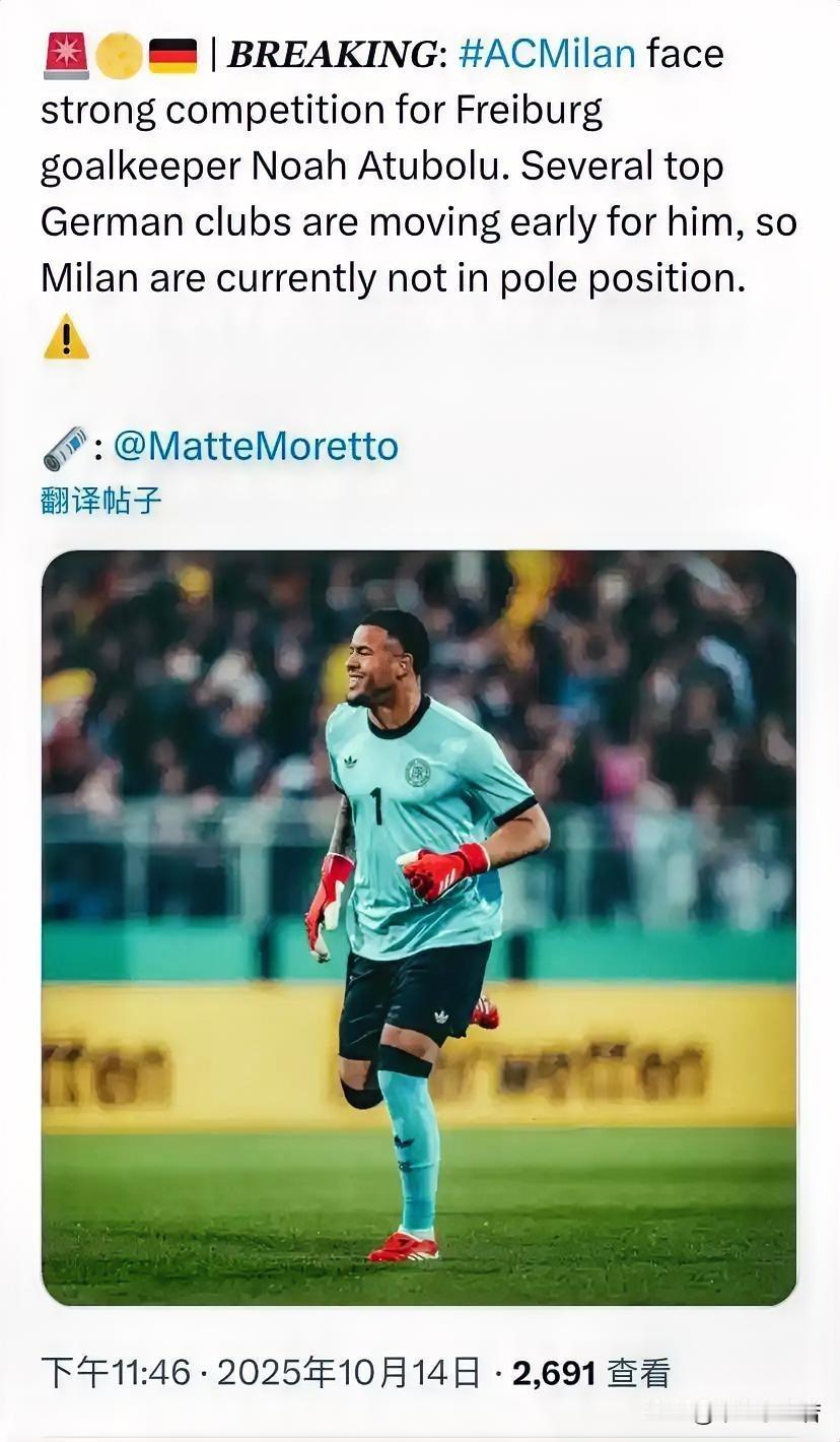 诺亚·阿图博卢!米兰对弗莱堡门将诺亚·阿图博卢充满兴趣,诺亚·阿图博卢是多家德甲俱乐部的目标球员,米兰对诺亚·阿图博卢并不处于领先位置。确实有多家德甲俱乐部关注诺亚·阿图博卢,但这些俱乐部都不是啥豪门球队,虽然米兰现在不是领先位置,但相信米兰介入诺亚·阿图博卢能做出正确的选择。 这个诺亚·阿图博卢虽然是今天才与米兰传出绯闻,但这个诺亚·阿图博卢是蒙卡达一直关注的球员,他在之前U系列世界杯表现出色,也是在青年世界杯他被蒙卡达所关注,在他还是弗莱堡轮换球员时候米兰就关注过他,或者说蒙卡达就向米兰推荐过他。 米兰的目标还包括意大利球员卡普里莱,但他目前还不被认为是首发级别的门将,诺亚·阿图博卢相比卡普里莱更像是是迈尼昂的接替者。这个诺亚·阿图博卢最近两年确实表现不错,诺亚·阿图博卢今年23岁,身高190,体重78公斤,他是德国国家队备选门将。
