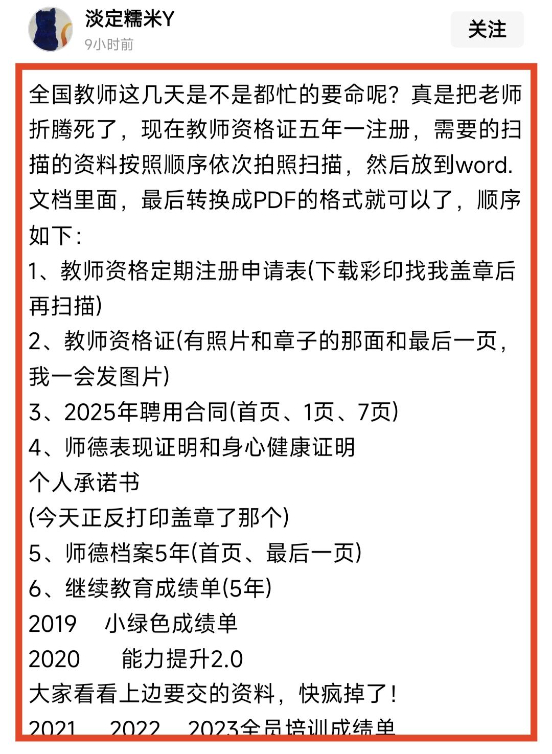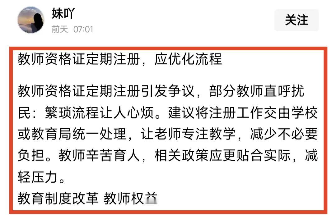 应简化教师资格证五年注册制度的流程。老师第一次教师资格证注册成功之后,以后五年一次的注册都应该由学校统一完成。一位老师是否满足注册条件,学校是最清楚的。现在继续教育学时,聘用书,师德表现等等,都需要每一个老师去学校开证明,这是把简单的问题复杂化。一所学校如果有200个老师,继续教育不合格或者师德出现问题的老师是极少的。所以完全可以由学校统一为全校合格的老师注册,这可能就是半个小时的事情,但现在每个老师都要去开证明材料,都要扫描上传,简单问题复杂化。信息时代是减轻大家工作量的,但修息时代很多事情反而越来越复杂。教育