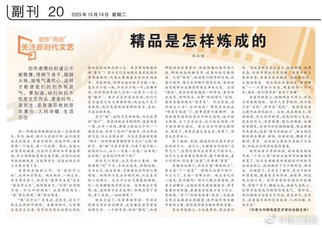 【林永健在《人民日报》撰文:某些顶流演员自带“编剧团队”进组,随时准备给剧本“动手术”】#林永健人日发文批某顶流演员排场大# 10月14日,《人民日报》刊发了中国电视艺术家协会副主席林永健的文章《精品是怎样炼成的》。