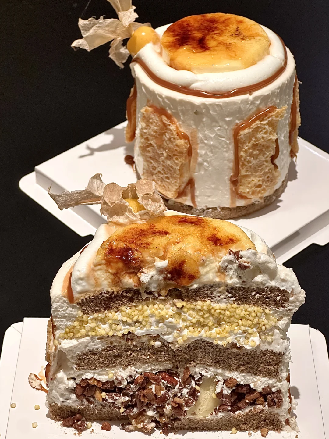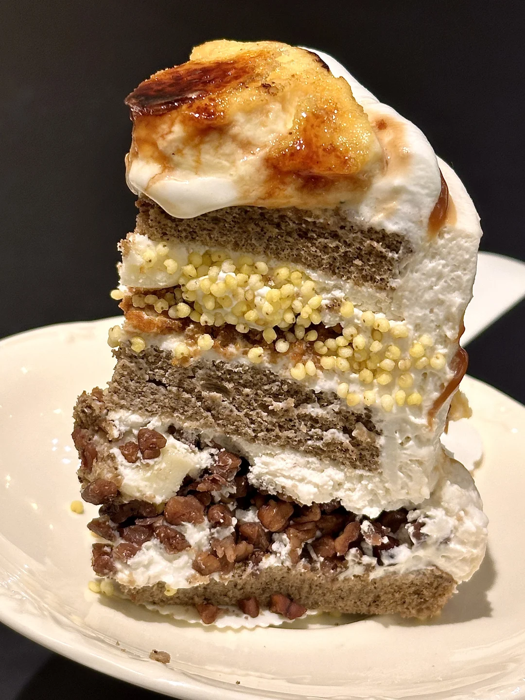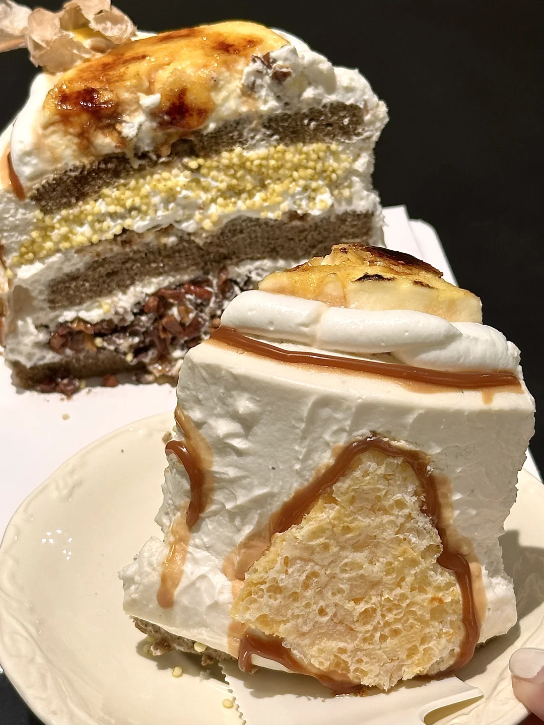 怎么可以这么好吃😭咸茶奶油好香啊 奶皮子奶味好浓 里面是黄米+碧根果+酸奶疙瘩夹心!蛋糕体也自带茶香味!长沙做甜品终于开窍了…🥹