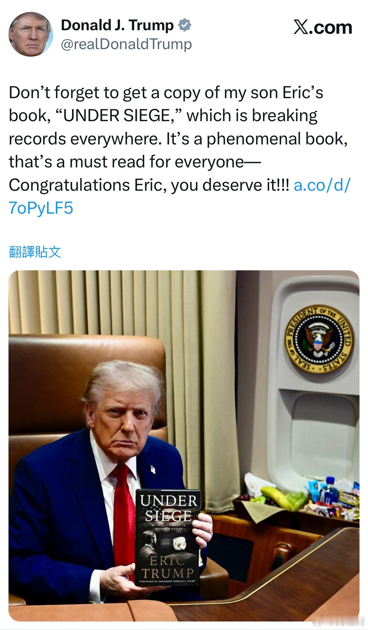 特朗普:“别忘了买一本我儿子艾瑞克的书《UNDER SIEGE》,这本书正在打破各地的纪录。这是一本非凡的书,每个人都应该读一读——恭喜艾瑞克,你值得拥有!”