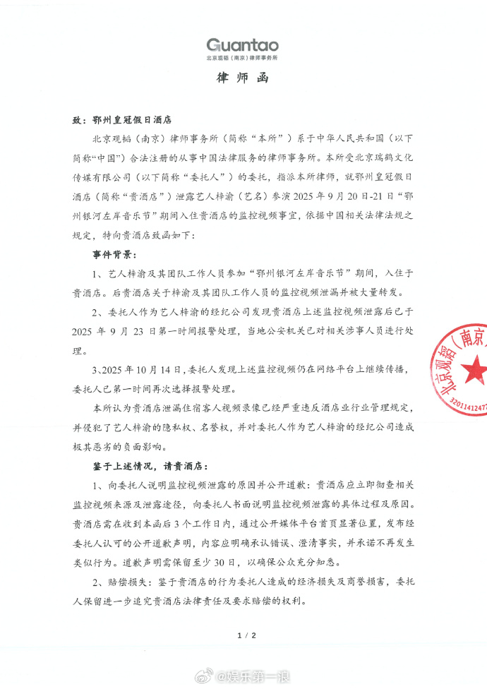 梓渝方就酒店监控泄露发律师函梓渝方律师函15日,发布“关于梓渝先生隐私