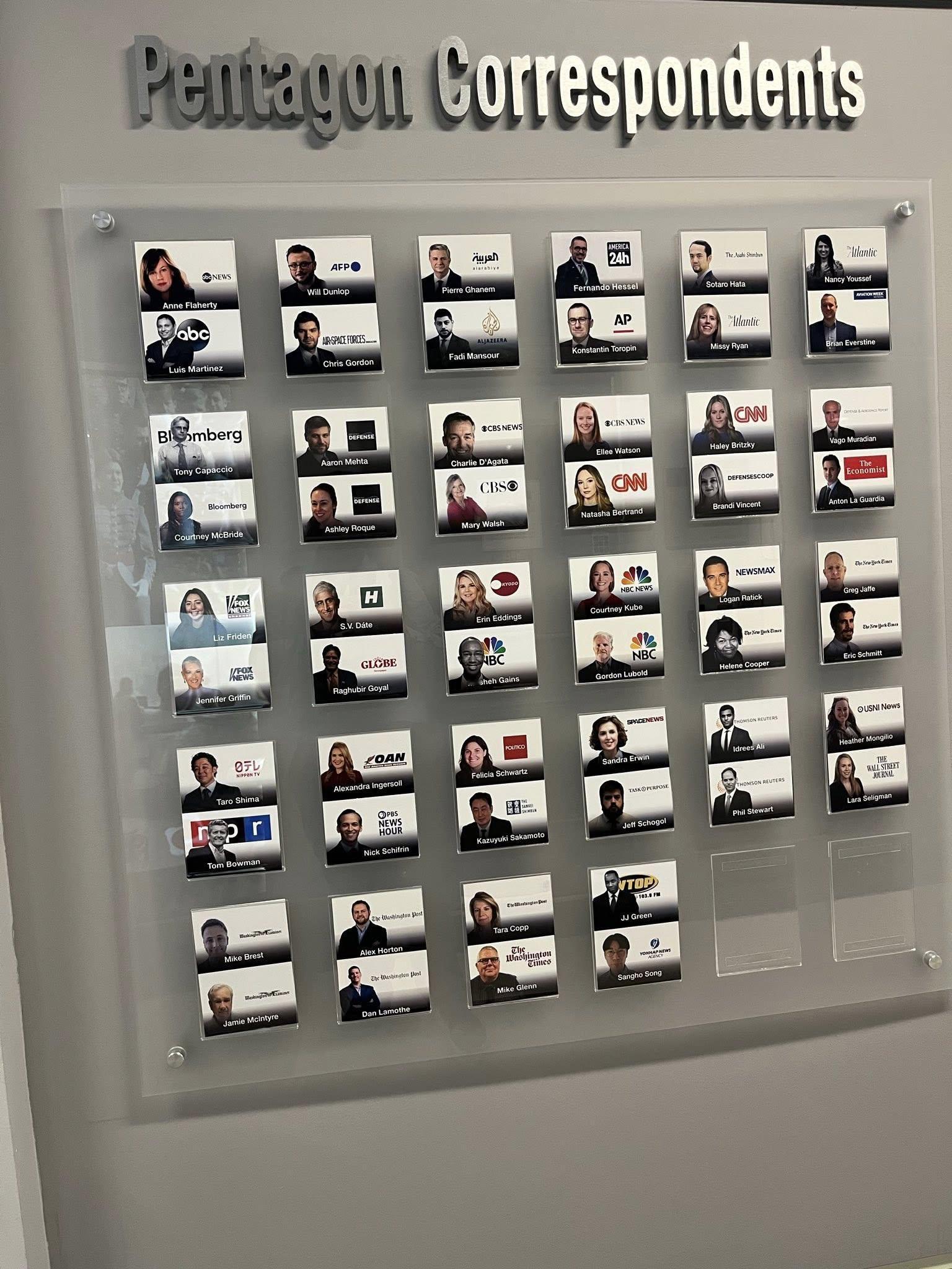 战争部传媒特派员(图2为各传媒的特派员) 10多年来都能够自由在战争部内参加记者会和采访官员得到这些在内部的消息来源,如果未来他们不签署同意新传媒政策的话就需要交出通行证。