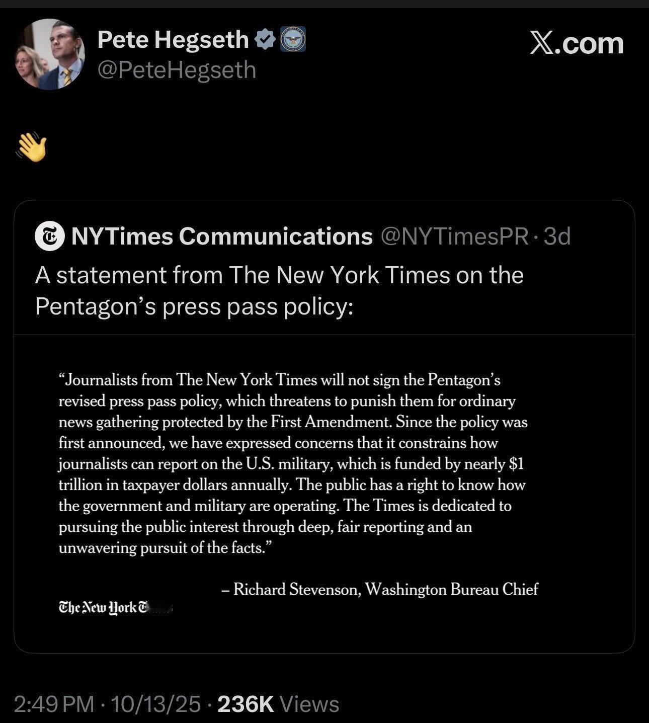 由于各大传媒都没有签署,这也代表自从艾森豪威尔政府以来,首次没有任何美国大型电视新闻台或报社将会在战争部内长期驻守。