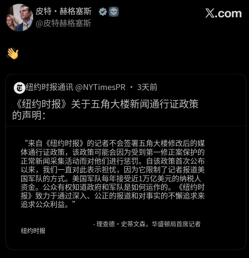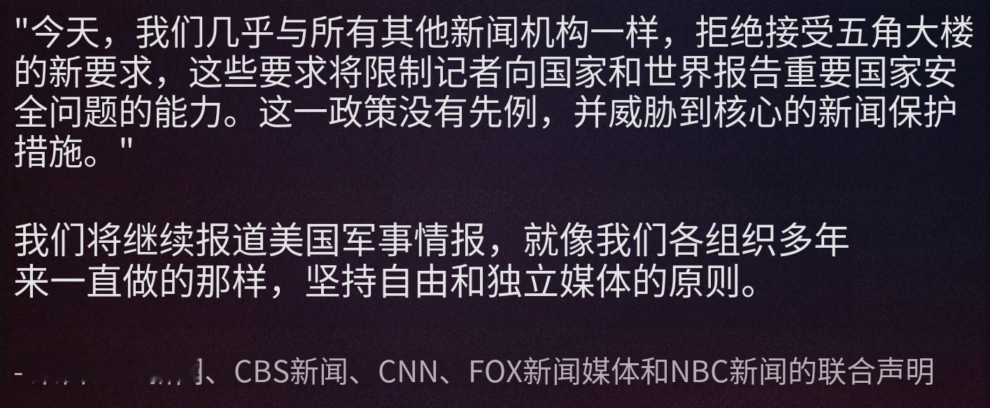我们之前经常能看到的美国媒体报道「有匿名官员指出XX计划进度落后」这类消息未来会变得越来越少,就算有的话也只能是出自于官方消息,美国战争部的新传媒政策将限制美国媒体获取和发布战争部没有批准的消息,即使该消息是非机密的也不行,美国国防部传媒协会(PPA)内的各传媒(除了One America News Network)纷纷反对签署同意国防部的新传媒政策,其中ABC News、CBC、CNN、NBC News和Fox News(!)等大传媒更是发出联署声明抗议。