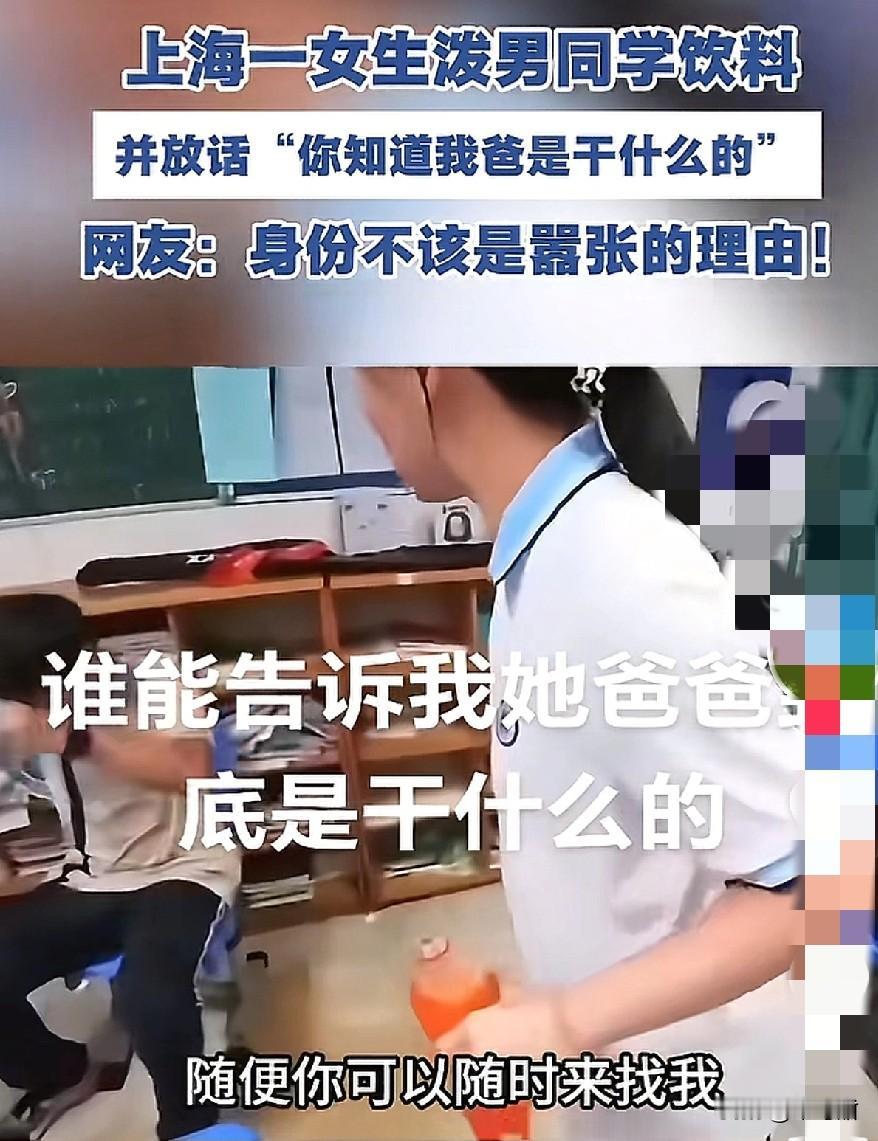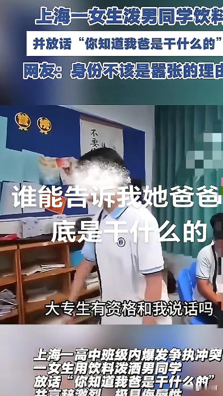 “你知道我爸是干什么的吗?” “你这种中专生,大专生都没资格和我说话” 那你爸到底是干什么的啊,能说出来吓唬吓唬我们吗? 上海某一学校,一女生朝一个男生连倒两瓶汽水,一直鬼叫式言语侮辱,周围没一个人敢站出来,估计已经习以为常了。 直到被侮辱的男生开始反击,一个戴眼镜的男生突然站出来帮忙,这种俗称“打手”的人,是非不分。就可以你的同学欺负人,不能别人反击她? 现在的学生,仗着家里的实力,在外面也为所欲为的,这谁家的女儿,快点领回去教育教育,也让我们知道,她爸爸是谁,让大家都避个雷,以后都躲着走,惹不起啊。 (图片来自网络视频)