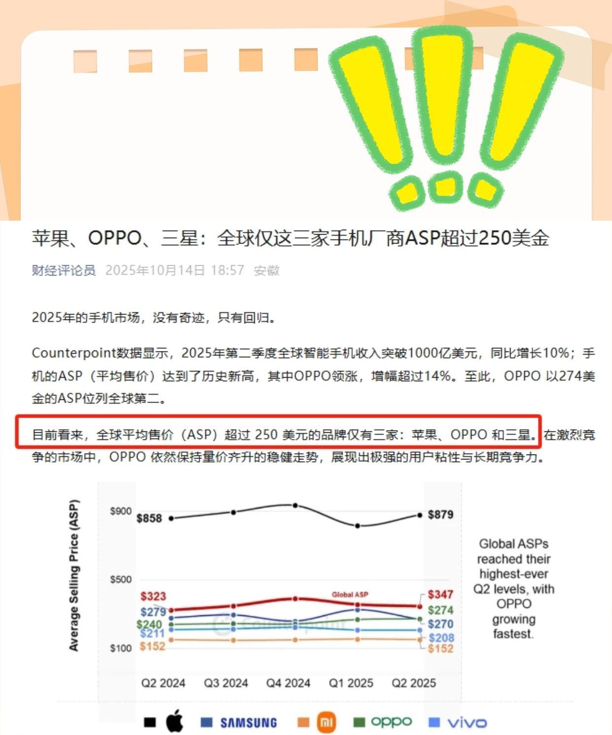 孙颖莎代言的OPPO用户粘性这么高 刚看了一份数据,说是全球平均售价(ASP)超过250刀的手机品牌仅有三家,分别是苹果、三星、OPPO!! 苹果不用多说,妥妥的高端玩家;三星靠折叠撑场;但OPPO这个位置,是真凭实力打上去的。高端化这几年不是嘴上说说,利润、产品力、研发投入都在往上走。 这说明什么?说明OPPO的产品力真的OK了! 明天,OPPO Find X9 系列就要发布了,作为孙颖莎同款手机,这代除了外观大改,影像、续航和屏幕也都有很大的提升,就看明天的价格如何了~ #OPPOFindX9 #孙颖莎 #OPPO #iPhone #用户粘性 #数码爆料 #高端旗舰 #刘作虎 #ASP #三星