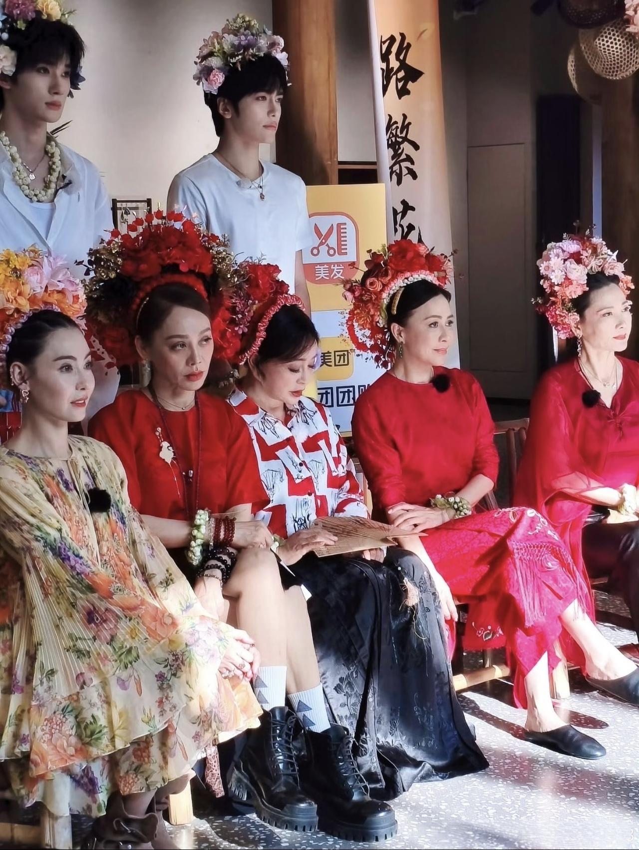 明星合影近照,一起拍综艺的大咖们,姐姐刘晓庆、刘嘉玲、宁静、何赛飞、张柏芝。 弟弟余宇涵、邵子恒,两位清新感十足的大帅哥,和姐姐们一起头戴花冠的样子,好nice啊。
