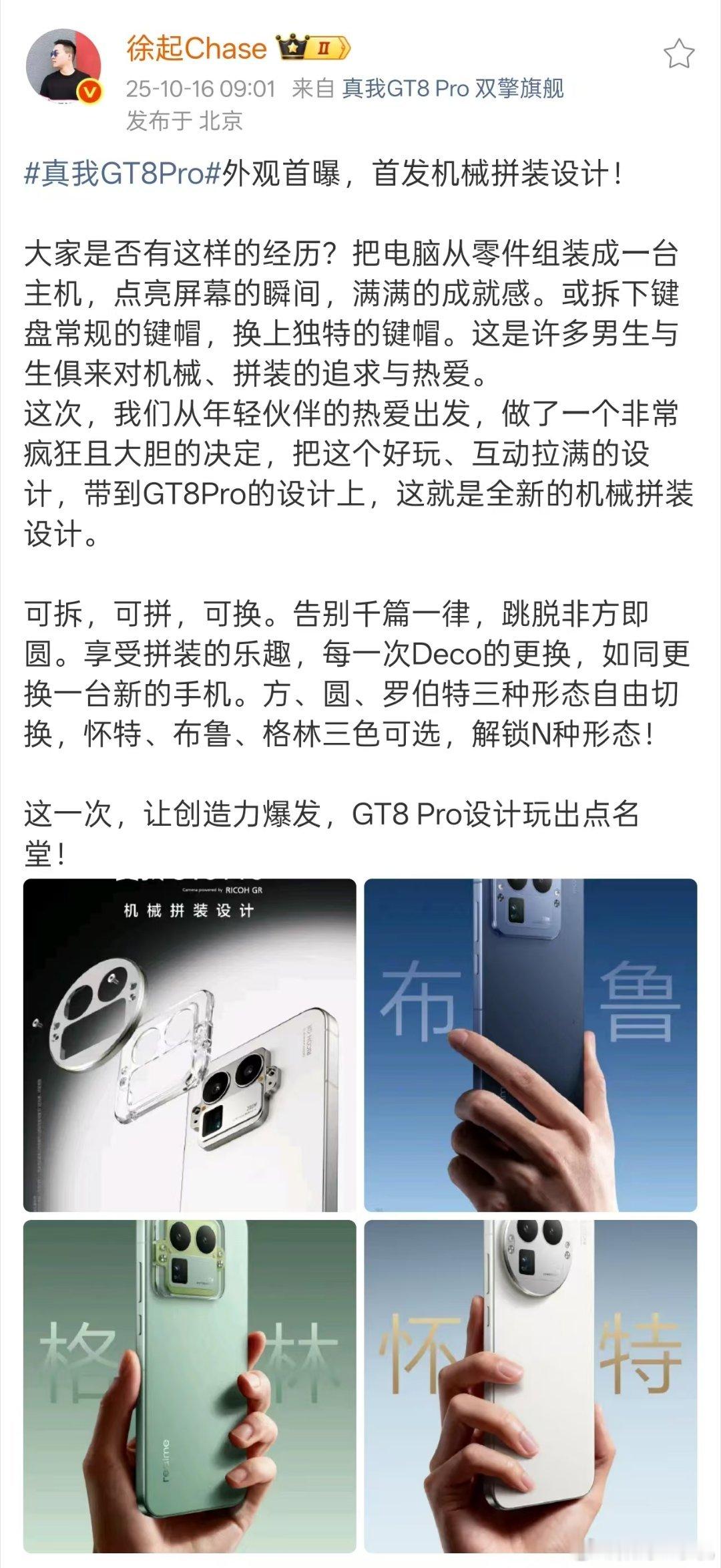 真我GT8Pro行业首创机械拼装设计,告别千篇一律,跳脱非方即圆。