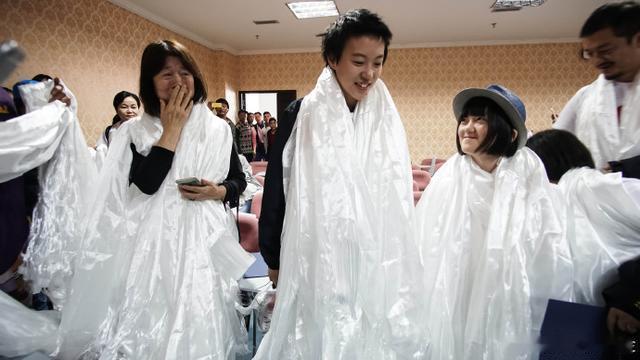 李嫣窦靖童披着个白袋子,姐妹俩笑得好开心呀,同一个妈生的孩子就是亲。