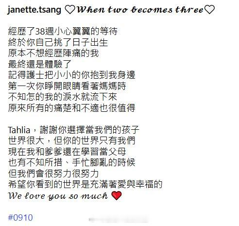 曾晓婷透露BB名为“Tahlia”:“谢谢你选择当我们的孩子,世界很大,但你的世界只有我们,现在我和爹爹还在学习当父母,也有不知所措、手忙脚乱的时候,但我们会很努力很努力,希望你看到的世界是充满着爱与幸福的。We love you so much”,曾晓婷获不少网民送上祝贺。