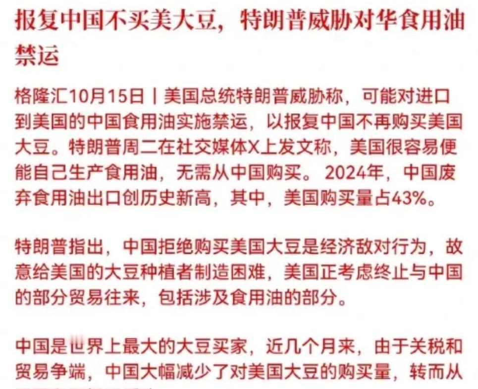 [浮云]特朗普又发癫了,不买大豆就禁运食用油! 特朗普又整出个新动静,在社交平台上发文说要是咱们不买美国的大豆,他们就不买咱们的食用油,以后改用地道的美国产食用油。 其实大伙儿仔细琢磨琢磨就知道,特朗普这说法压根站不住脚。有官方数据显示,美国从咱们这儿进口的食用油占比连 0.3% 都不到,这么点量对他们整个食用油市场来说,简直就是九牛一毛。 那他们平时从咱们这儿进口的跟 “油” 相关的东西到底是啥呢?其实是废弃食用油,也就是咱们常说的 “地沟油”,但这些废油可不是用来吃的,而是运到美国后,经过处理加工成生物柴油和可再生航空燃料。 要知道现在全球都在推清洁能源,美国在这方面需求不小,咱们的废油刚好能满足他们这部分需求,而且价格还挺合适。 再说说美国大豆滞销这事儿,这可不是一天两天的问题了。前几年美国大豆就因为各种原因,出现过库存积压的情况,农民们为此愁得不行。 这次特朗普想通过威胁禁运食用油来逼咱们买大豆,说白了就是想转移国内的矛盾,给美国农民一个交代,可这招明显没找对路子。 咱们国家在大豆采购上,早就不是只盯着美国一家了,这些年一直在拓展采购渠道,巴西、阿根廷等国家都是咱们重要的大豆进口来源地。 就拿去年来说,咱们从巴西进口的大豆量就占了总进口量的一半以上,美国大豆在咱们的进口份额里,早就没以前那么重要了。 从贸易逻辑审视,双方于这两个领域绝非相互依存之关系。彼此在这方面缺乏那种紧密相连、互为倚靠的内在联系,并非是相互依赖的状态。 他们需要咱们的废油来搞能源转化,要是真禁运咱们的食用油,先不说对咱们没影响,反而可能让他们自己的生物能源产业陷入困境,到时候找替代货源不仅得花更多钱,还不一定能及时供应上。 咱们买大豆的选择多了去了,少了美国大豆,完全可以从其他国家补上来,根本不会受啥影响。 还有个事儿挺有意思,之前美国也搞过类似的贸易威胁,结果大多是雷声大雨点小。就像前几年对咱们部分商品加征关税,最后反而导致美国国内相关商品价格上涨,老百姓买单,不少美国企业也因为成本增加叫苦连天。 此次食用油禁令的威胁,大概率不过是一场自我作秀。这般行径,恰似一场华而不实的表演,除了吸引些许目光,于实际问题的解决毫无助益。 说到底,特朗普这波操作就是没搞清楚实际情况,拍脑袋想出来的办法。现在全球贸易早就你中有我、我中有你,靠威胁、施压的方式根本行不通,只有互利共赢才是长久之计。 美国要是真想解决大豆滞销问题,不如好好想想怎么提高大豆品质、降低生产成本,或者跟其他国家好好协商,拿出诚意来谈合作,而不是动不动就搞威胁那一套,这样不仅解决不了问题,还会让自己在国际上的形象受损。 总结一下,特朗普这次拿食用油禁运说事儿,就是一场不切实际的自我表演,对咱们没啥影响,反而暴露了美国在解决国内问题上的无力。 咱们在国际贸易中,早就有了足够的底气和多样的选择,不会被这种没道理的威胁牵着走。未来不管国际市场怎么变,只要咱们坚持互利共赢的原则,拓展更多合作渠道,就能在贸易往来中始终掌握主动权,实现更好的发展。 (主要信源:澎湃新闻——特朗普威胁不买中国食用油报复中方“故意不买美国大豆”,外交部回应)
