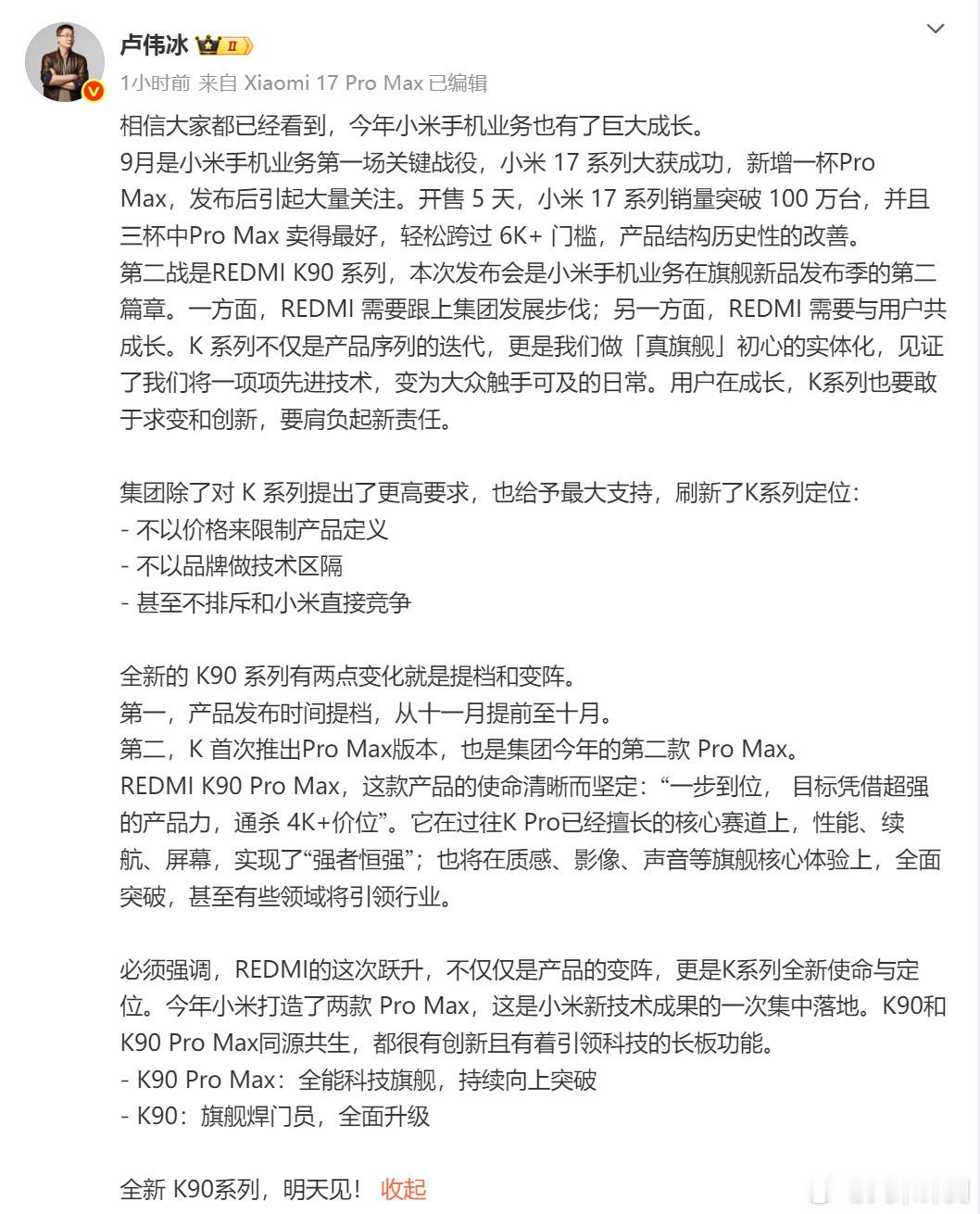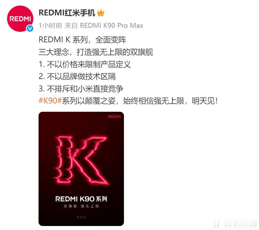 [笑而不语]K90系列明天官宣,不排斥和小米直接竞争,这是要重现当年K20Pro的名场面么?目前看这次还是2个型号,标准版和ProMax,不过后者的配置及定位会进一步向上突破~