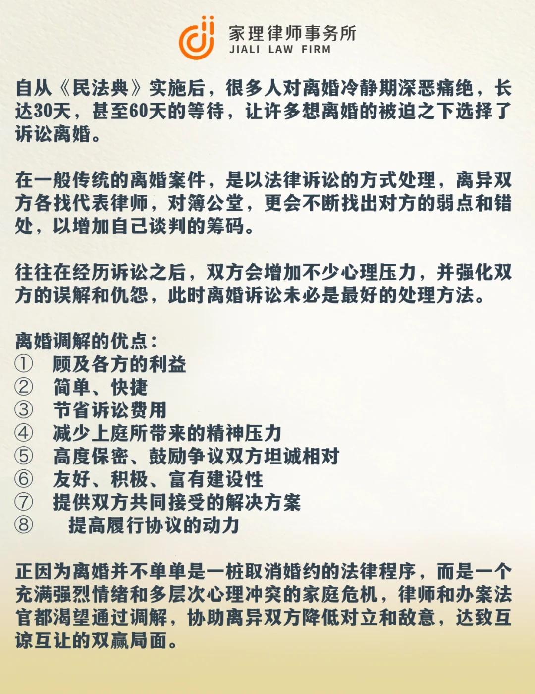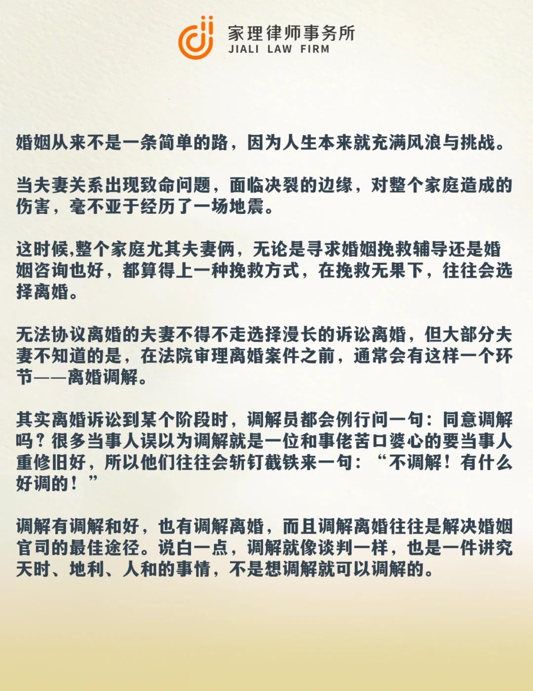 北京离婚|离婚到底要不要调解 面对婚姻危机,民众传统思维是和为贵、轻诉讼,不到万不得已不会打官司。绝大多数找律师代理诉讼的人群,往往是长期协商无果后的无奈选择。 诉讼一旦开启,在漫长的诉讼过程中,当事人精神备受折磨,常常处在崩溃边缘。而诉讼也只能处理法律层面的问题,包括离婚法定程序、财产分配和孩子抚养权等。 调解比诉讼更多关心到双方的感受和财务以外的需求,例如对子女的成长关注、如何继续共同养育子女以降低父母离婚对孩子的影响、探视安排等,最后带领双方达成协议。 当事人通过调解,可以避免把争议诉诸法庭,既省时又省钱;相比于诉讼,调解的过程快捷得多,当事人因而可早日达成和解。 在家理律所办理的离婚案件中,那些懂得反省自己、期望通过适当条件的让步来达成一致的当事人,多半能达成和解或离。 而这样的当事人往往较少,更多的当事人在离婚时很少去反省自己,不愿承认自己是有问题的一方。 律师调解,从来都不是争输赢论高低,而是要协助当事人自主协议,达成共识,从当事人争议焦点出发,出具一份规范整齐、法律依据引用明确、焦点分析逻辑严谨的律师调解意见书。 调解的结论是双方当事人都可以接受的方案,减少冲突,以解决家庭纷争。 北京家理律师事务所 离婚律师 离婚财产分割 抚养权 北京离婚