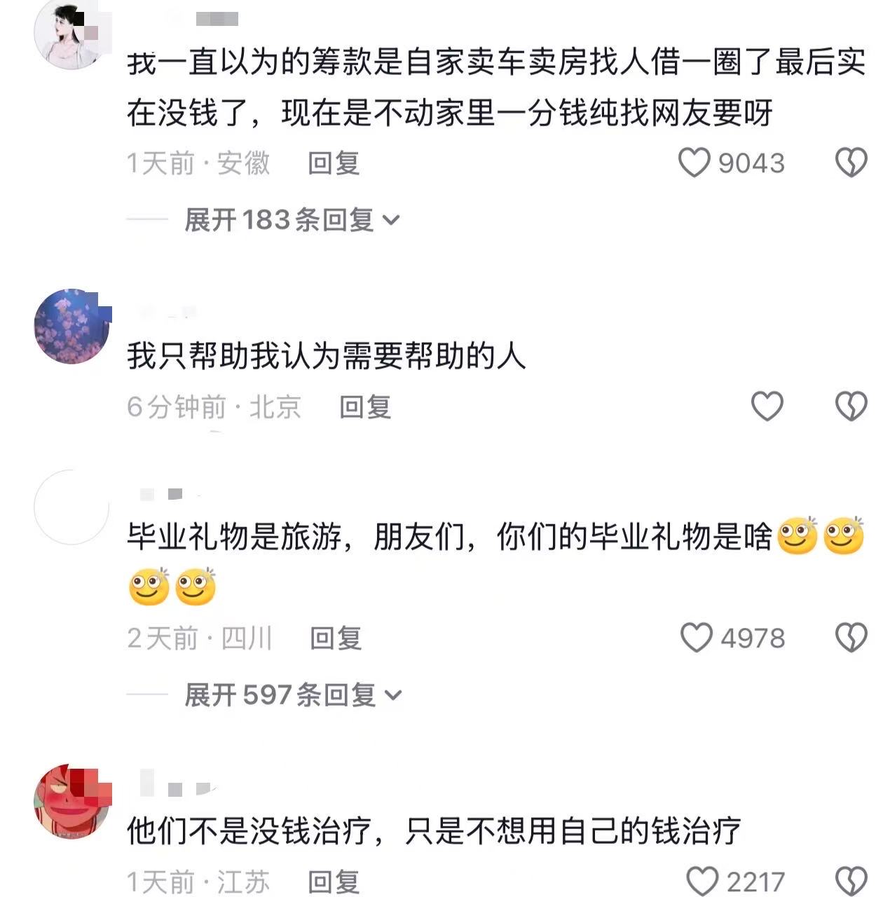 “ 我一直以为的筹款是自家卖车卖房卖桌子,找人借一圈了最后实在没钱了,现在是不动家里一分钱纯找网友要呀!”