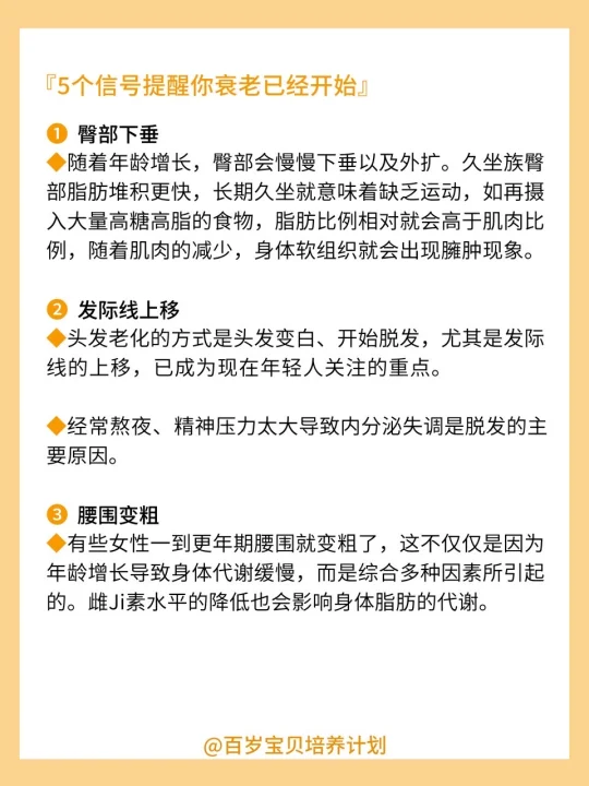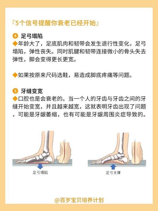 衰老是每个人不可避免的 臀部下垂、发际线上移 腰围变粗、足弓塌陷、牙缝变宽 出现这5个信号 说明衰老已经来临 但也不必太过害怕 衰老作为正常的生理过程也有办法能延缓! 保持稳定的睡眠习惯有助于延缓衰老 帮你改善睡眠的5个方法 快收藏~