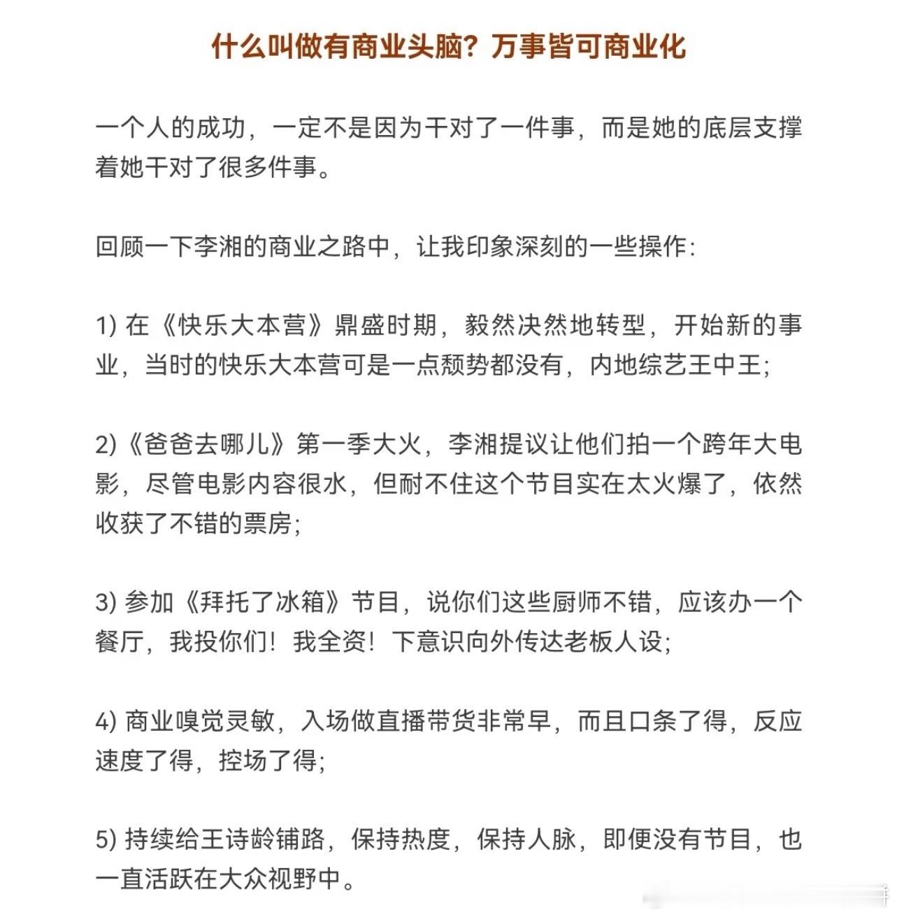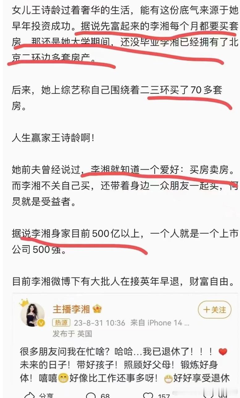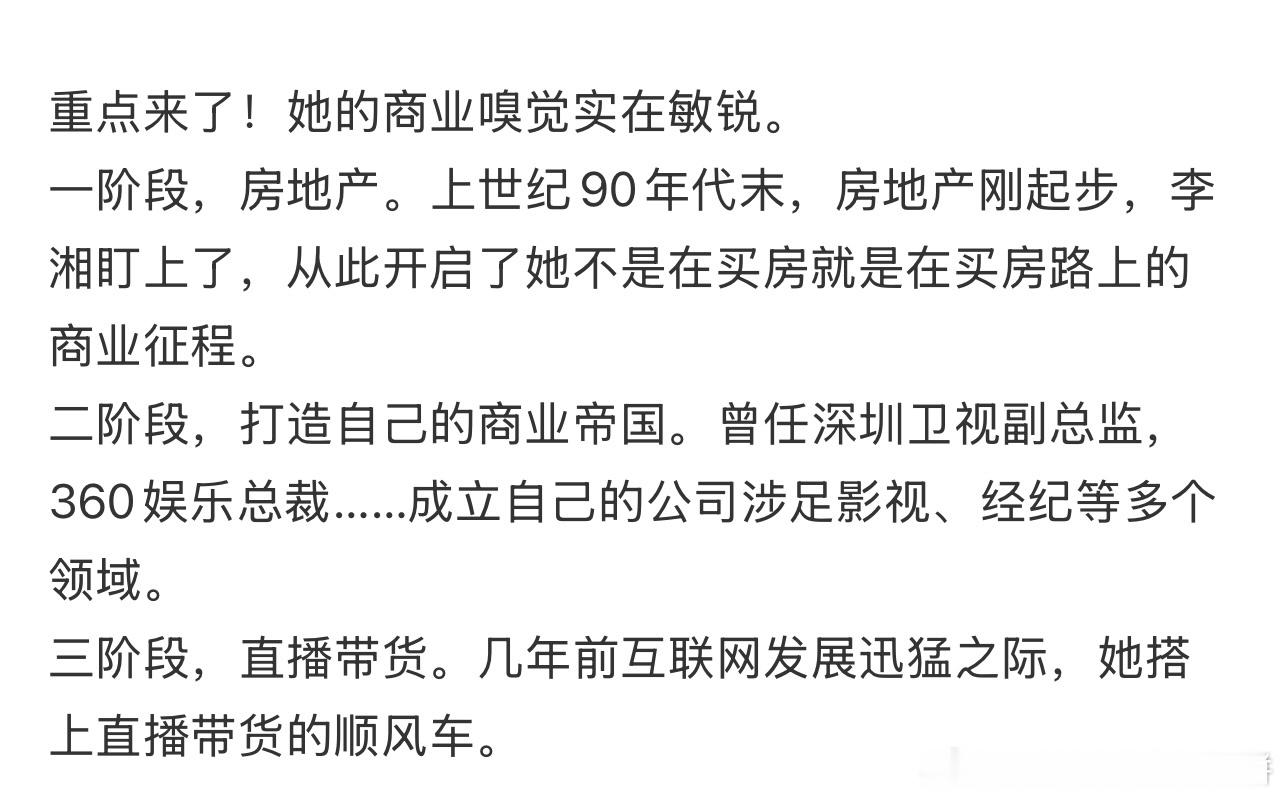 芒果出来的的主持人也太能赚钱了,我才看到爸爸去哪儿的李锐一直在做生意,在迪拜拿了12亿订单;李湘早年围绕着北京二三环买了几十套房子,让自己女儿做成了头几批明星小孩ip,做综艺做直播带货(她好像是第一个开始做的明星),投资字节跳动 ​​​