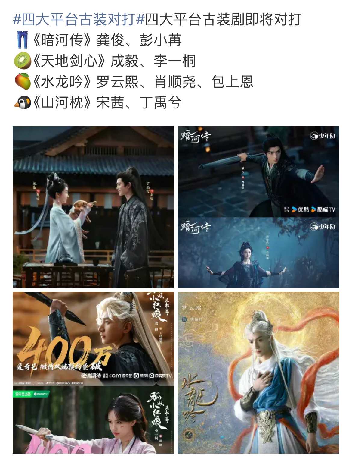 四大平台古装对打暗河传、水龙吟、天地剑心、山河枕至少得有一部爆剧吧……你们准备
