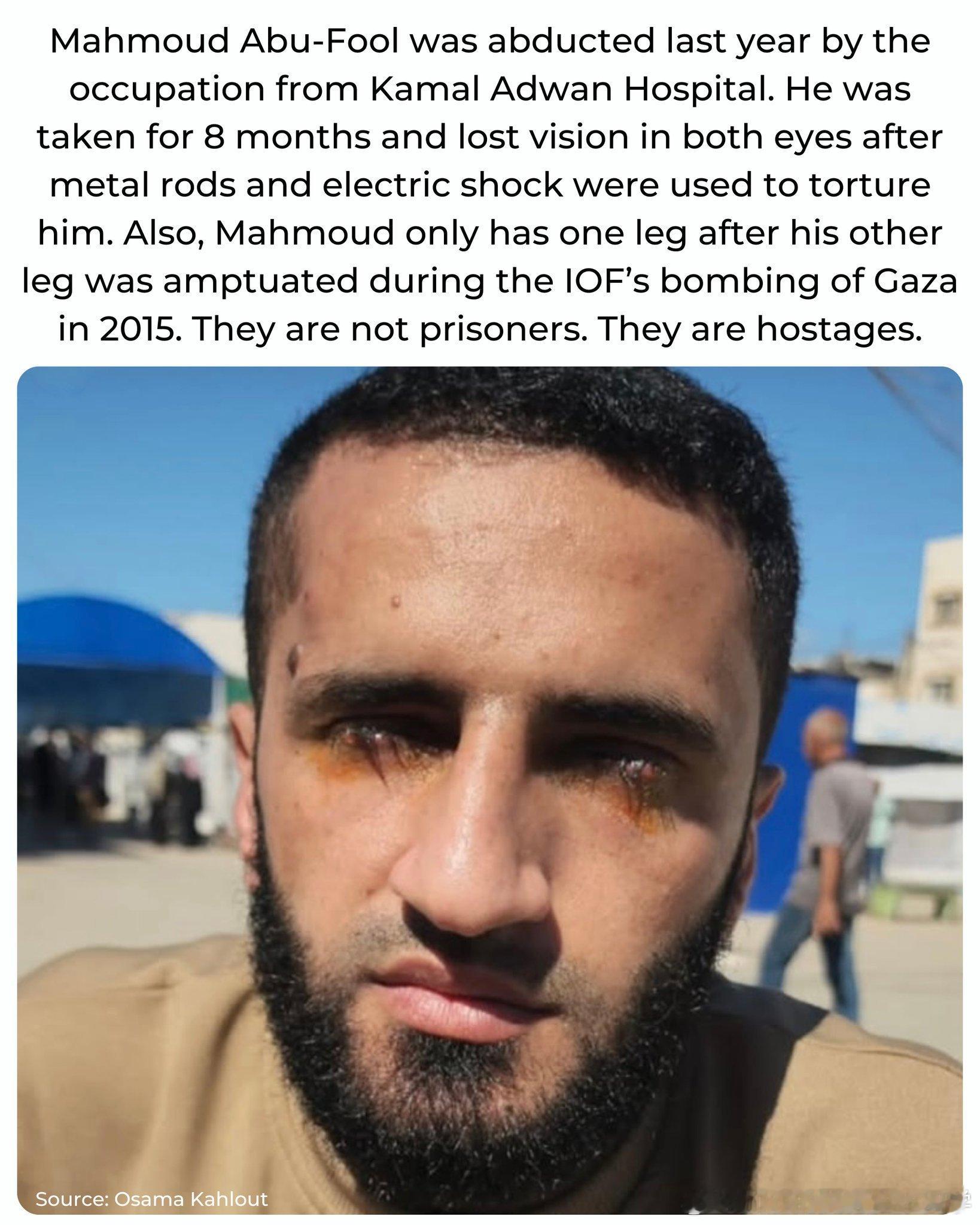 🟥被释放的巴勒斯坦人质——28岁的马哈茂德·阿布·福尔(Mahmoud Abu Foul)——在以色列的酷刑营中遭受了铁棍殴打和电击等严重折磨,导致他失去了一条腿和双眼。
