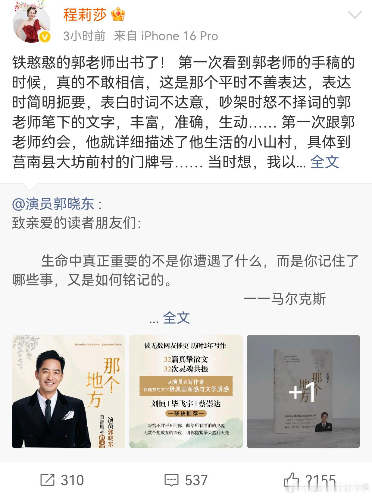 程莉莎吐槽郭晓东铁憨憨谁被撒狗粮了!程莉莎为郭晓东新书打call,叫他“铁憨憨