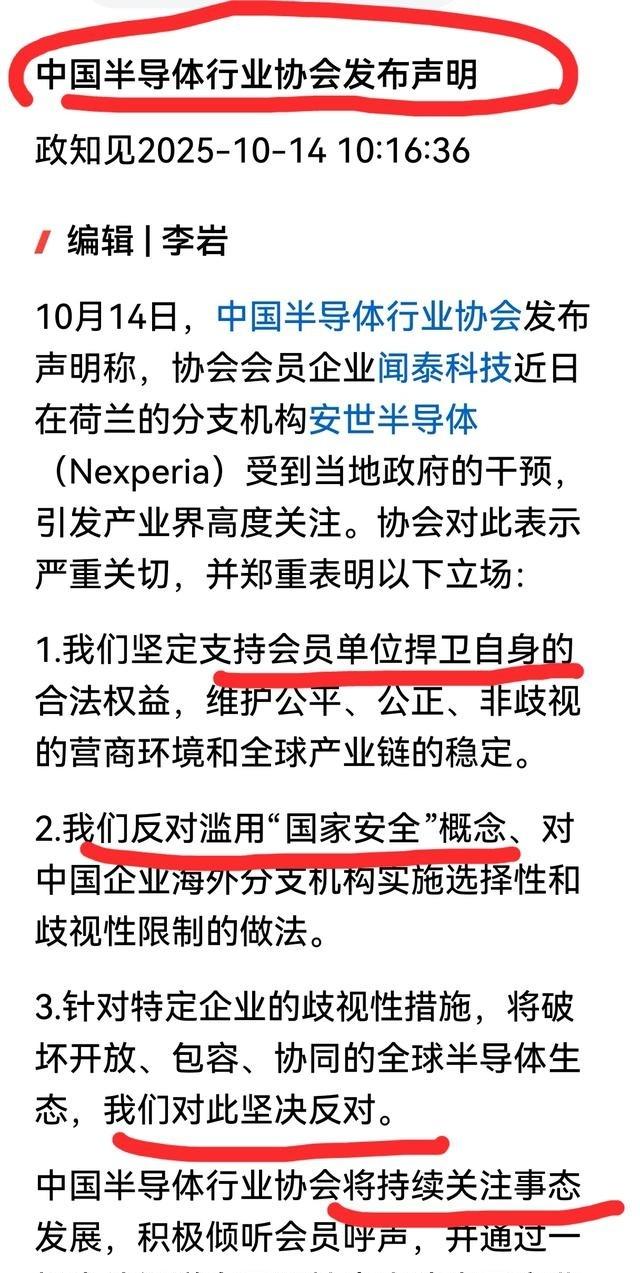 中国的反击一向是先礼后兵,后发制人。中国半导体行业协会在10月14日首先发声,对荷兰政府就安世半导体(Nexperia)公司采取的“歧视性”干预表示“严重关切”,这是中国有关方面做出的第一步反应,声明里有几个关键词: 中荷之间本是生意场上的伙伴,结果荷兰政府突然插手一家中国企业,闹得沸沸扬扬。安世半导体这家公司,原本是荷兰本土的芯片制造商,专做汽车和消费电子的功率器件,2019年被上海的闻泰科技全资收购后,发展得风生水起,年营收上百亿欧元。可谁成想,2025年10月12日,荷兰经济事务部直接下令,援引什么《货物可用性法》,冻结了安世的全盘运营,还暂停了CEO张学政的职务。官方理由是“严重治理缺陷”和“经济安全风险”,但明眼人都看得出,这跟美国施压脱不了干系。法庭文件一曝光,美国早在几个月前就要求荷兰撸掉中国籍高管,否则就把安世拉进实体清单。结果呢,荷兰就这么干了,临时接管公司决策权,能否决任何资产转移、人员变动啥的。安世员工照常上班生产,但高层动弹不得,供应链一卡壳,欧洲车企的芯片供应就得跟着抖三抖。 中国这边反应不急不躁,先从行业层面入手。10月14日,中国半导体行业协会就站出来了,这协会是国内芯片企业的娘家,成员上百家,影响力不小。声明直奔主题,说对荷兰政府这波操作表示严重关切,点名是针对会员单位闻泰科技的海外分支。为什么先从协会发声?因为这步走得稳,既给了企业撑腰,又不直接升级到国家对抗。声明里几个关键词特别扎眼,第一是“坚定支持”会员单位捍卫合法权益,这话听着就接地气,意思是协会不是光说不练,会帮着出谋划策、协调资源。第二是“反对滥用国家安全概念”,直指荷兰借着“经济安全”大旗搞选择性和歧视性限制,这不光针对安世一家,瞄准的其实是所有中资科技企业海外布局。第三是“坚决反对”针对特定企业的歧视性措施,强调这种单挑中国企业的做法,违背了公平竞争原则。声明最后还说,会持续关注事态发展,通过一切合法渠道向国际社会表达诉求。简单说,就是先礼貌提醒你荷兰,别一意孤行,咱们有的是办法对话,但也留了后手。 这套路一看就是中国一贯的先礼后兵。协会声明一出,等于给荷兰扔了个软钉子,表面上关切为主,骨子里警告别玩火。紧接着,商务部就行动了,10月14日晚间通知下来,禁止安世从中国工厂出口特定成品零部件和子组件。这步后发制人,卡得准,因为安世的供应链大头在中国,汉堡、曼海姆这些欧洲厂子离不开国内的晶圆和组装支持。出口禁令一落实,安世的生产线就得减速,荷兰本土的汽车巨头大众、宝马啥的,供应链一断,成本蹭蹭上涨。闻泰科技也没闲着,官网挂出严正声明,指责荷兰干预基于地缘政治偏见,违背欧盟开放市场原则,还说会通过法律途径维权。股价那天跌了10%,但公司高层表态,会寻求政府支持,推动谈判。整个过程,中国没大张旗鼓喊口号,而是用事实说话,让对方自己掂量掂量。 安世10月13日发了公司更新,确认政府禁令生效,禁止任何资产挪动或高管变动,但生产继续正常。荷兰那边,经济部长在议会辩论时强调,这是“极为特殊”的决定,针对治理问题,不是政治化。但中国不买账,协会持续跟踪,商务部出口限制也执行得铁板钉钉。闻泰科技已经在阿姆斯特丹法院提起上诉,准备打持久战。说到底,这波操作暴露了西方在科技领域的双标。荷兰自己ASML的光刻机卖给中国赚得盆满钵满,转头就卡中资企业的脖子。安世收购后,投了上亿欧元扩产汉堡厂,创造了上千就业,本是双赢,现在闹成这样,谁得利?