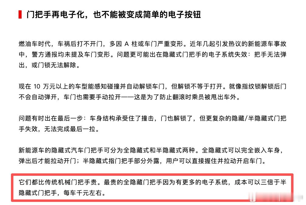 根据晚点的报道,现在依赖电子系统进行开门的隐藏、半隐藏式门把手,如果要增加机械装置需要每车增加百元左右成本。