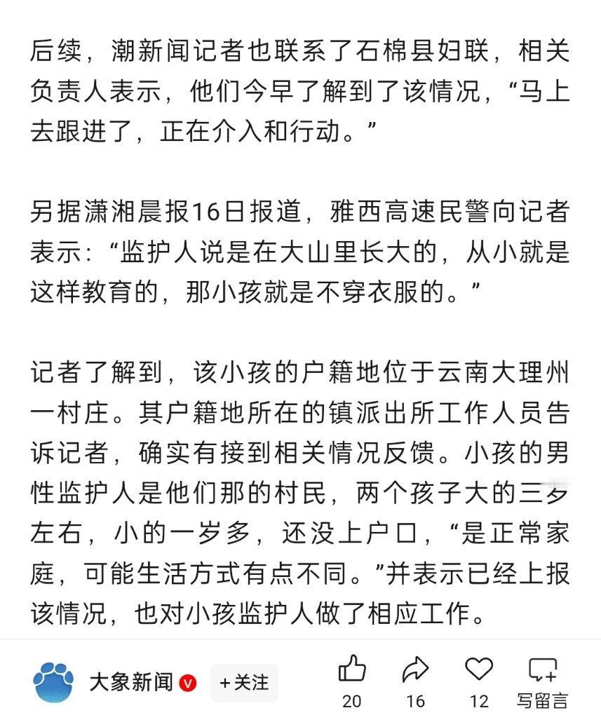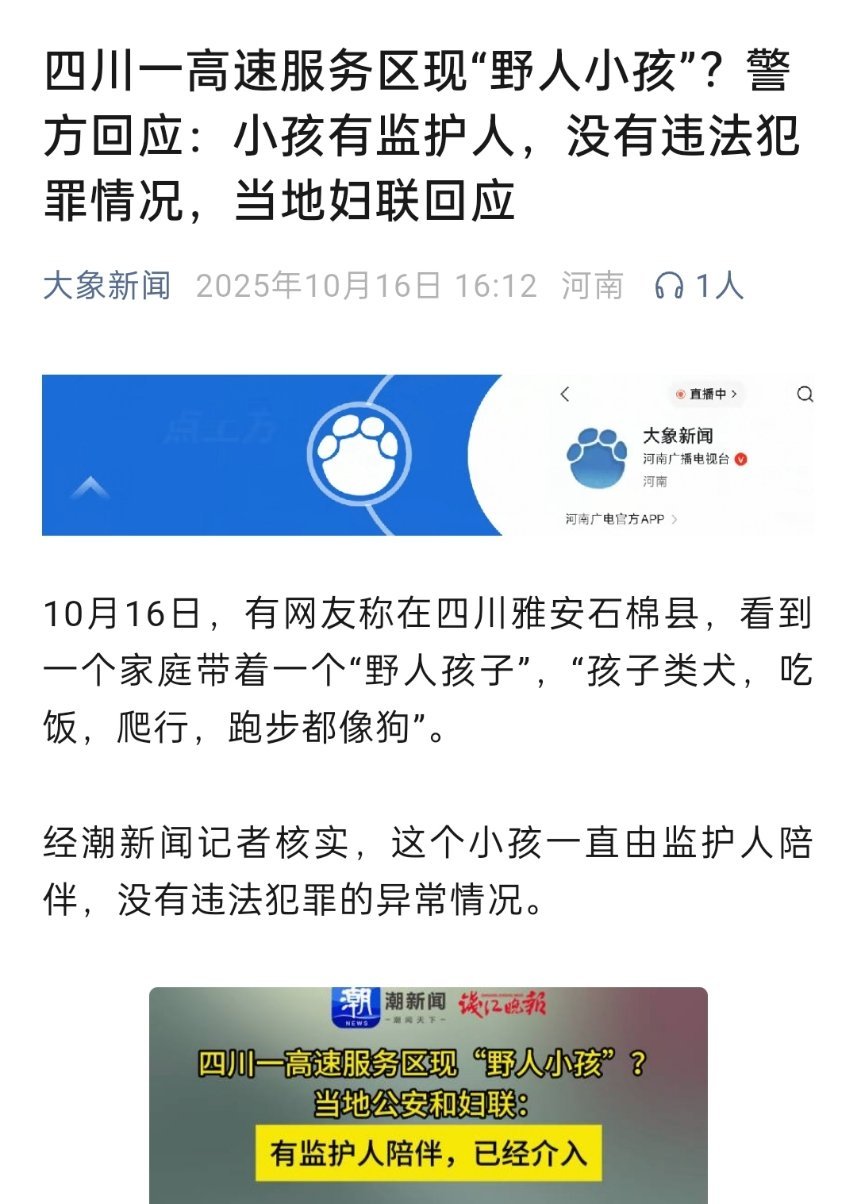 🔻四川一高速服务区现“野人小孩”?警方回应:小孩有监护人,没有违法犯罪情况。