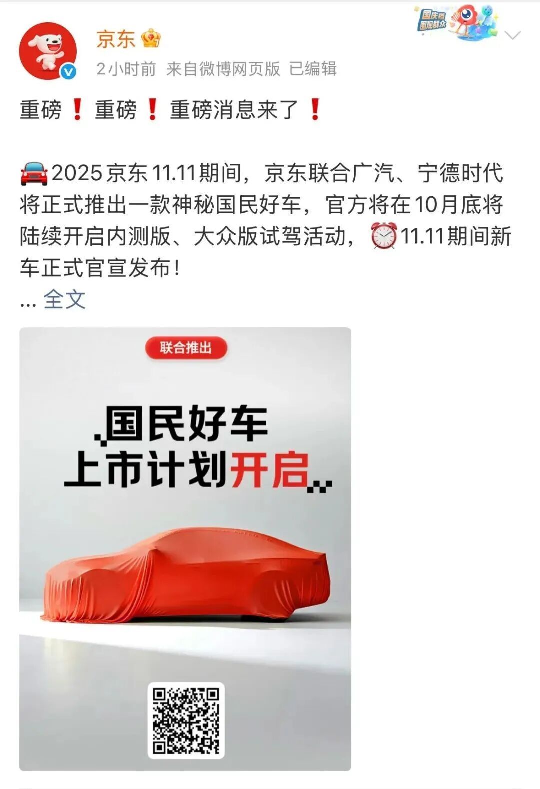 车市热门[超话] 14日,京东宣布,联合广汽、宁德时代将推出一款汽车,并于10月底陆续开启内测版、大众版试驾活动,11月9日新车正式发布。即日起,用户可在京东App搜索“国民好车”提前预约试驾。另据宁德时代的工作人员透露,三方推出的这款车为换电车型。