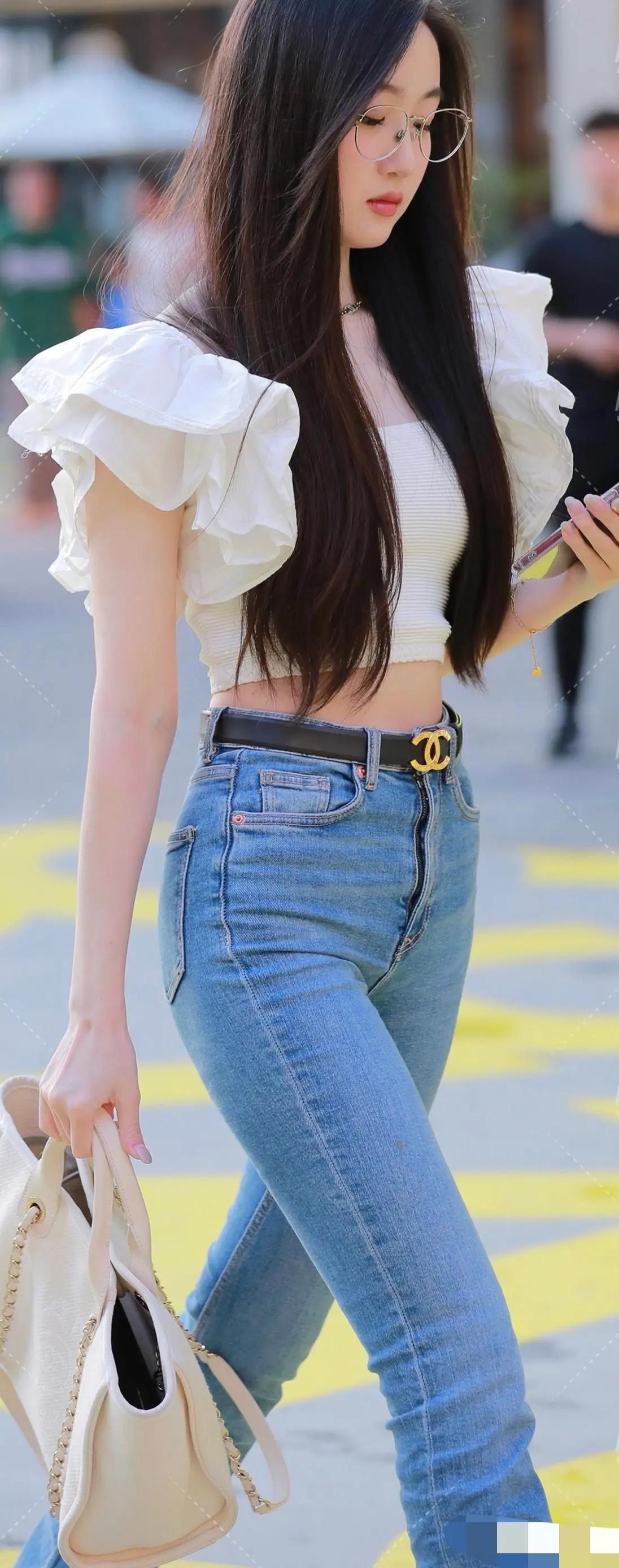 穿着紧身牛仔裤的眼镜妹走在大街上,成为一道靓丽的风景!牛仔裤美照穿搭街拍好