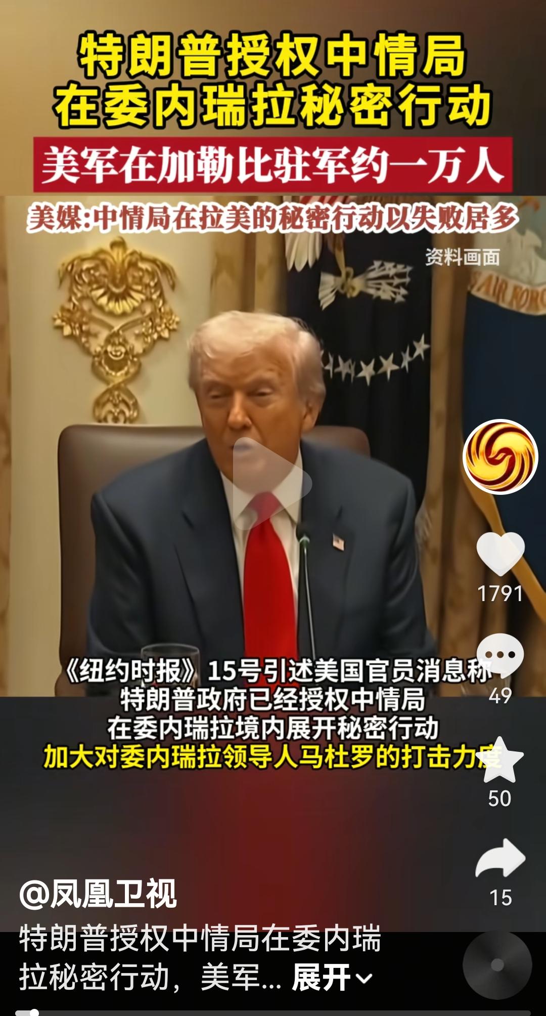特朗普授权美国中情局对委内瑞拉动手 根据美国纽约时报报道,10月15日美国总统特朗普已经授权中情局在委内瑞拉境内开展秘密行动 加大对委内瑞拉总统马杜罗的打击行动 美国官员也已经表明把马杜罗赶下台就是他们的目标 这个方案制定者是美国国务卿卢比奥和中情局长拉特克里夫 特朗普已经在9月份以来5次下令对委内瑞拉以缉毒为名对委内瑞拉船只打击,导致27死亡,目前美军在委内瑞拉驻军已经超过1万人,并且一个海军陆战队团队准备渗透到委内瑞拉境内实施动乱美国对委内瑞拉作战进入倒计时了吗 图片来自凤凰卫视视频
