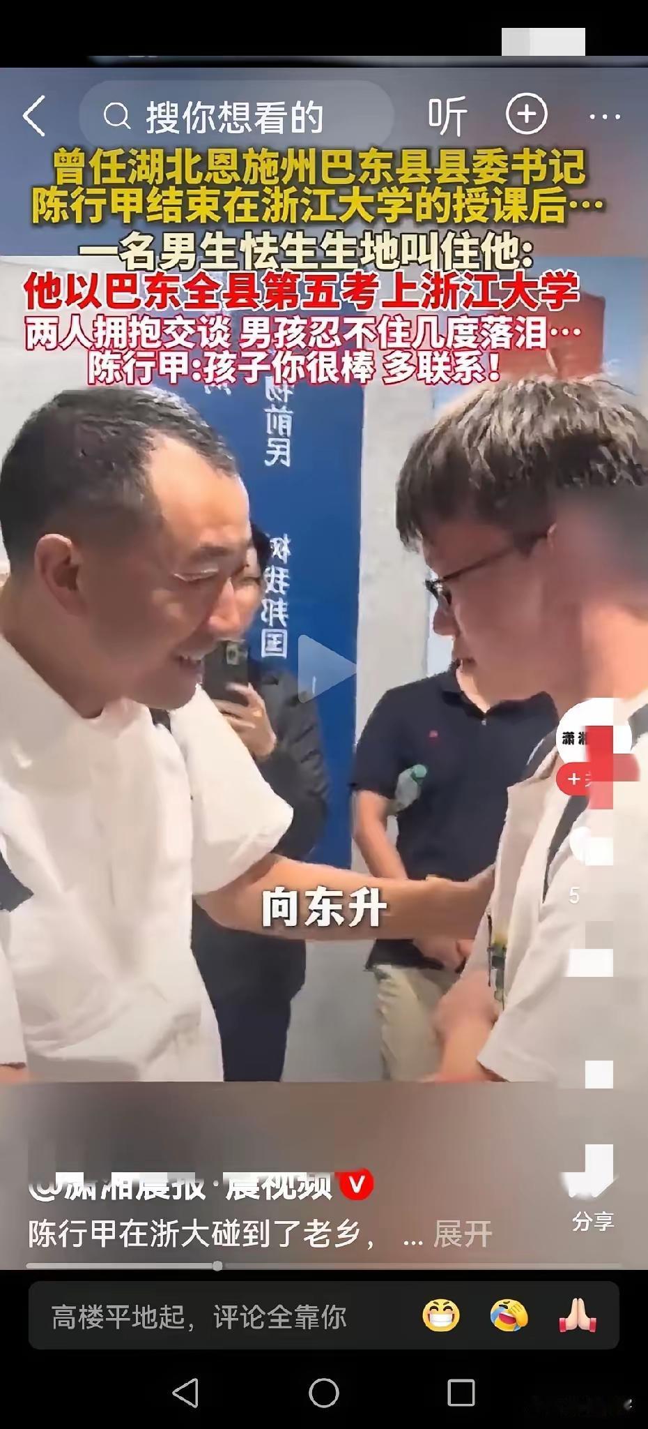 陈行甲在浙大讲完课,那场面,学生们,都抢着和他交流。临上电梯时,一句“陈书记”,让他停住了脚步。回头一看,是个怯生生的巴东男孩。 曾经在巴东,任职过的陈行甲,一下就被拉回,到那段的时光。他和男孩两次紧拥,言语激动,直接对他说“孩子,你很棒”。陈行甲他知道,从巴东那个小县城,考到浙大有多难,便问男孩名次。 网友们表示 这就是陈行甲在巴东孩子的心里种下的希望和未来,让他们知道这个社会还是有好领导好党员有真真正正为人民服务的父母官。榜样的力量大无穷。 以孩子的年龄来看,他对陈书记的印象肯定是家长、老师的讲解,进入全国一流大学,就要像陈书记那样将来造福家乡。 以孩子的年龄来看,他对陈书记的印象肯定是家长、老师的讲解,进入全国一流大学,就要像陈书记那样将来造福家乡。 陈行甲的故事,已经渗透到每一个敬重他和感恩他的人的心里。其实,这就是榜样的力量,百姓的呼声,社会的肯定与认可。 愿千千万万年轻的学子能以陈行甲为榜样,以后如果成为一个领导也能象陈一样为人民谋幸福!造福一方![赞] 大家怎么看呢