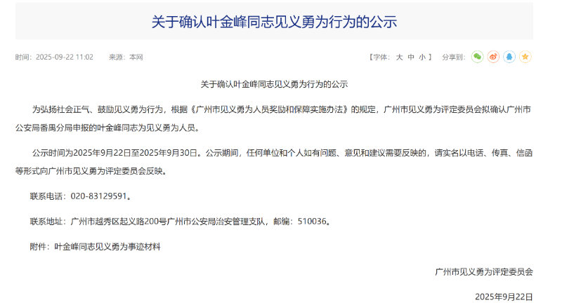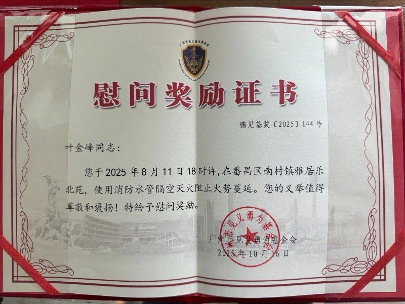 【#隔空救火好邻居获见义勇为基金会奖励#】今年8月12日,大皖新闻记者报道了广州番禺区居民叶金峰跪抱水枪隔空灭火一事,引起广泛关注。10月16日记者从广州市见义勇为基金会获悉,鉴于叶金峰使用消防水管隔空灭火阻止火势蔓延的义举,该基金会特为其颁发了“慰问奖励证书”。叶金峰表示,他深感荣幸。